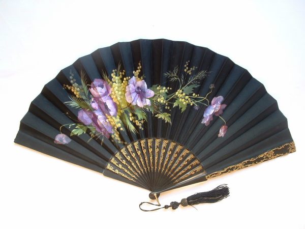 Eventail plié, vers 1890. Feuille en soie noire gouachée d'anémones et de mimosas. Monture en bois noirci, découpée et peinte de guirlandes de fleurs dorées. Brillant à la rivure.