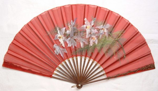 Eventail plié, vers 1890. La feuille en crêpe rouge, gouachée de lis blancs.