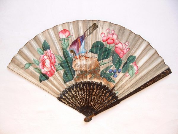 Eventail plié double-face, Chine, fin XIXe. Feuille en papier, gouachée de scènes de la vie quotidienne. Au revers, une pie dans un arbre en fleurs.