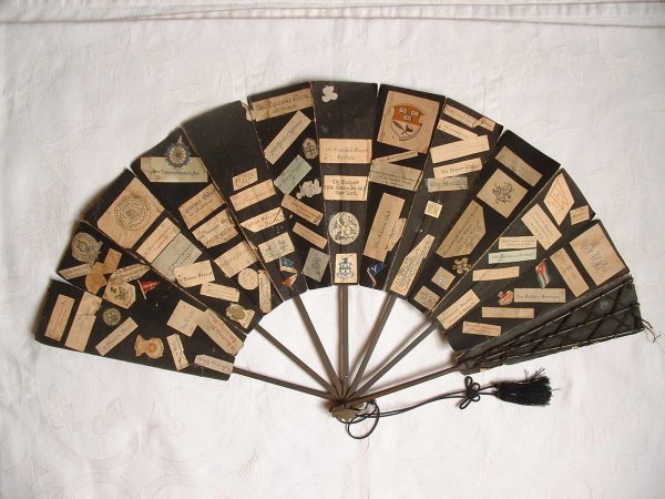 Eventail de voyage, fin XIXe. Sur la feuille en papier peinte en noir, les souvenirs des lieux visités aux Etats-Unis, collés sur les deux faces.