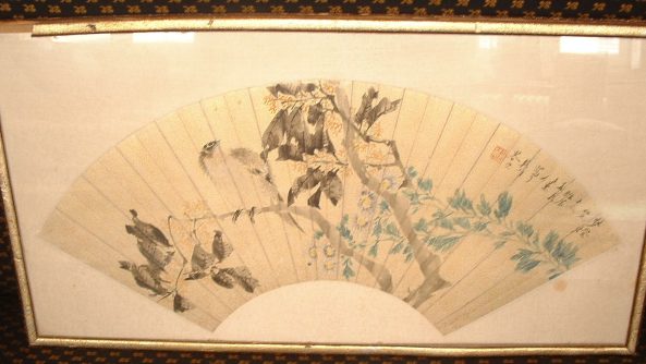 Feuille d'éventail chinoise démontée, deuxième moitié du XIXe. Lavis d'encre sur fond poudré d'or. Un oiseau dans un arbre en fleurs. Calligraphie chinoise. Cadre (avec une partie de baguette manquante).