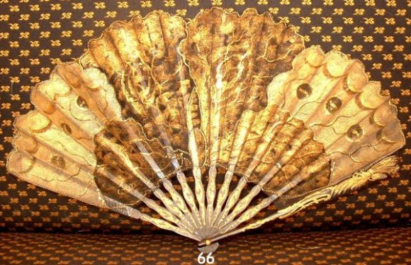 Eventail en forme de papillon, signé Tutin (Ronot-Tutin), vers 1900. La feuille en gaze de soie noire, brodée de fils d'or, cousue de paillettes et nuancée de peinture dorée.