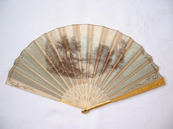Eventail plié de style Empire, vers 1900. Feuille en taffetas de soie lithographiée et aquarellée, avec rehauts de gouache. Scène de discussion mondaine, dans un jardin. Au revers, un village au bord d'un étang. Lithographie signée au dos : Nyon J.