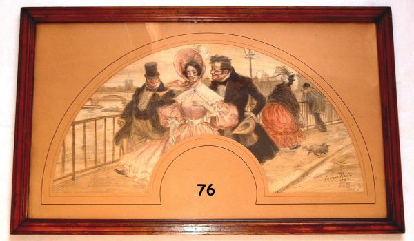 Projet d'éventail chromolithographié sur papier, signé Georges Redon, 1904. Au premier plan, un couple à la mode en pleine séance de badinage sur un pont de Paris, sous le regard d'un passant ventru en redingote. Cadre en bois. (Très bon état).