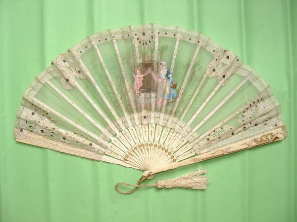 Eventail plié, vers 1920. La feuille en gaze peinte à la gouache d'une jeune fille avec un panier de fleurs, en compagnie d'un angelot. Dentelle décorée de fleurs en métal cousues.