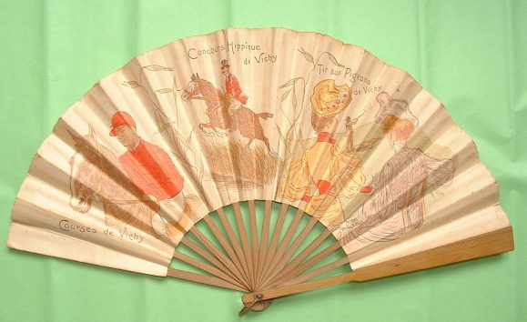 Eventail publicitaire signé René Péan (1875-1945), pour le Cercle hippique international de Vichy, vers 1905. Course, saut d'obstacles et épreuve de tir aux pigeons sous le regard de deux élégantes. Au revers, des fleurs d'amandier. Imprimerie C. Bougarel. Monture en bois.