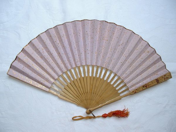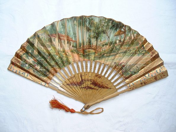 Eventail publicitaire, pour la Residencia de Maximo Gomez, au Mexique, début XXe. Scène de jardin sud-américaine, avec terrasses et tonnelles noyées sous la végétation. Au revers, feuille rose parsemée d'éclats de feuilles d'or.