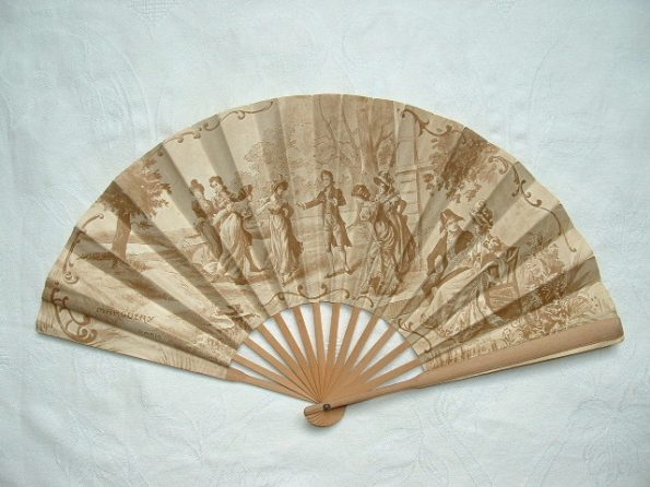 Eventail pour Marguery. Paris, début XXe. Partie de colin-maillard entre jeunes gens. Par les éventaillistes Francolin, gilet et Cie. Monture en bois.