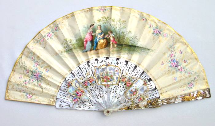 Monture en nacre, très finement repercée et ajourée d'une scène d'hymen et de trophées. Rehauts or, argent, vermeil. Au revers bouquets fleuris gouachés.