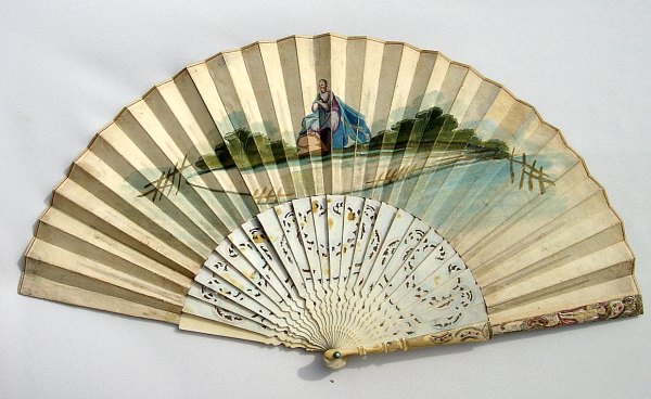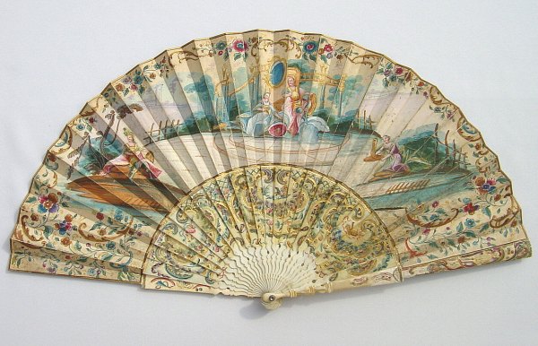 Eventail plié, vers 1770-1780. Feuille en papier peinte à la gouache, scène de cour, l'offrande du café dans un décor d'architecture champêtre. Rehauts or et encadrement de fleurs et arabesques.