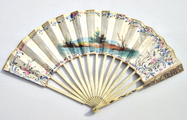 Eventail plié, vers 1770-1780. Feuille en papier peinte à la gouache. Trois cartels encadrés de dorures, feuillages, fleurs et attributs champêtres. Au centre conversation galante à trois personnages. Dans les cartels latéraux, des personnages animés.