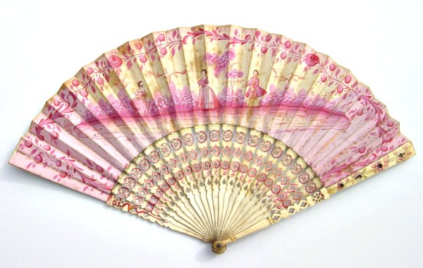 Eventail plié, vers 1780-1790.Feuille en papier peinte à la gouache en camaïeu de rose et rehauts blancs. Trois personnages dans un décor champêtre. Au revers, une fleur stylisée. (Mouillures).