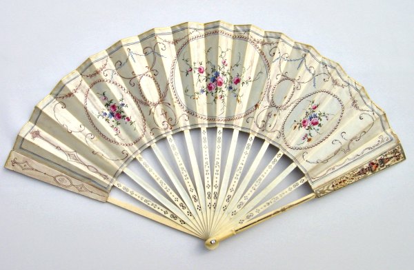 Eventail plié, vers 1770. Feuille en tissu. Gouache de trois médaillons de scènes à l'Antique, de personnages à guirlandes de fleurs et en son centre sur le thème de l'Enfance. Broderies de pastillages dorés et argentés et de couleurs, rehaussant et encadrant les médaillons.