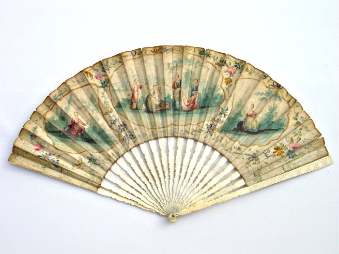 Eventail plié, fin XVIIIème-début XIXème. Feuille en papier peinte à la gouache. Trois cartels encadrés de dorures, feuillages et fleurs. Au centre, scène autour de Moïse enfant. Dans les cartels latéraux, personnages animés.