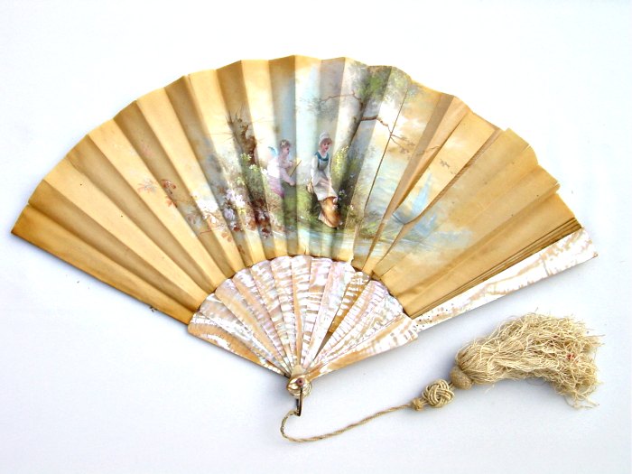 Eventail plié, fin XIXème-début XXème. Feuille en satin peinte à la gouache signée Jolivet. Scène champêtre.