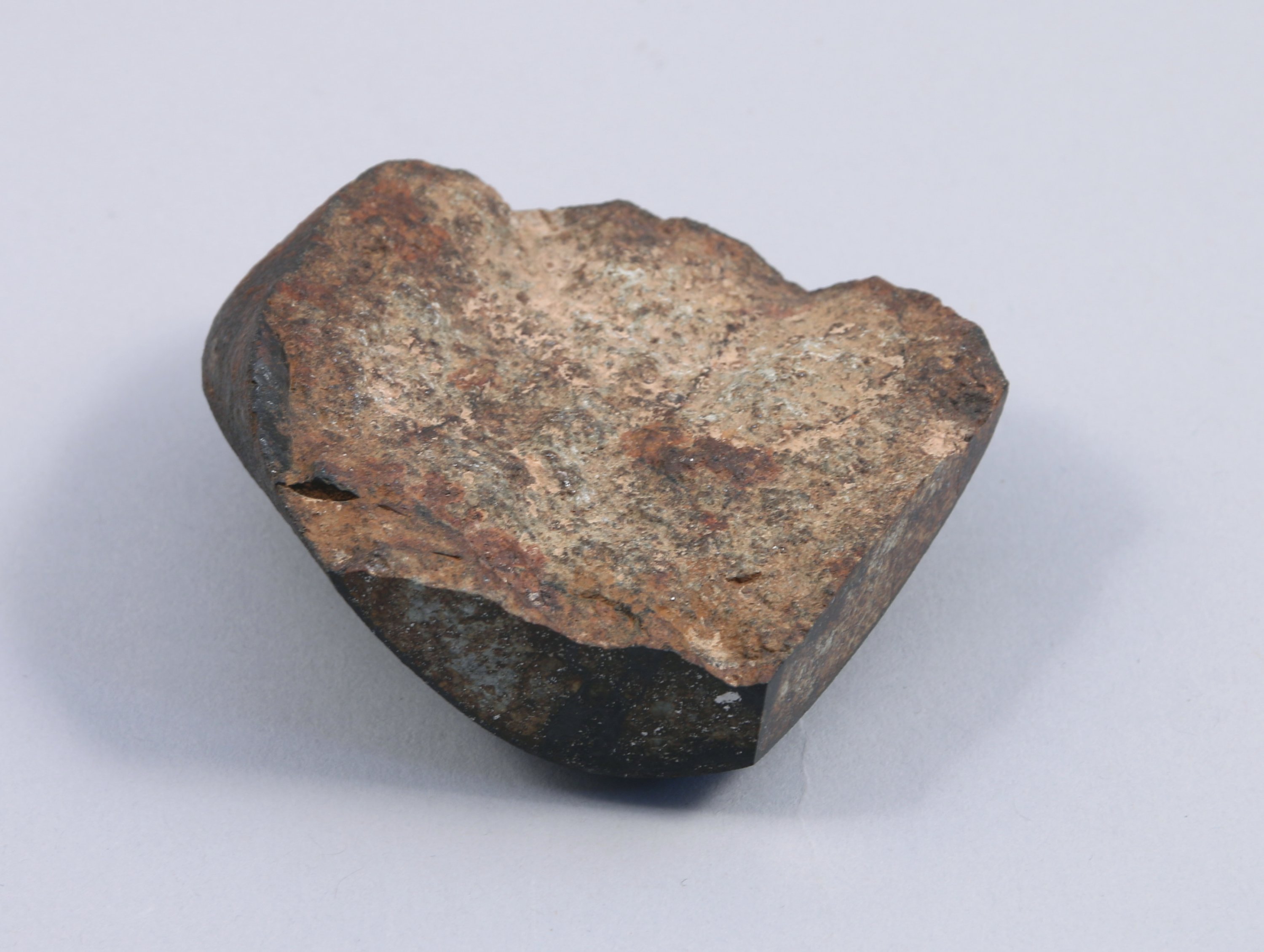 CHONDRITE LL5. Une MÉTÉORITE MAROCAINE à jolie matrice intérieure riche en chondre et ferronickel. Deux faces tranchées et polies.