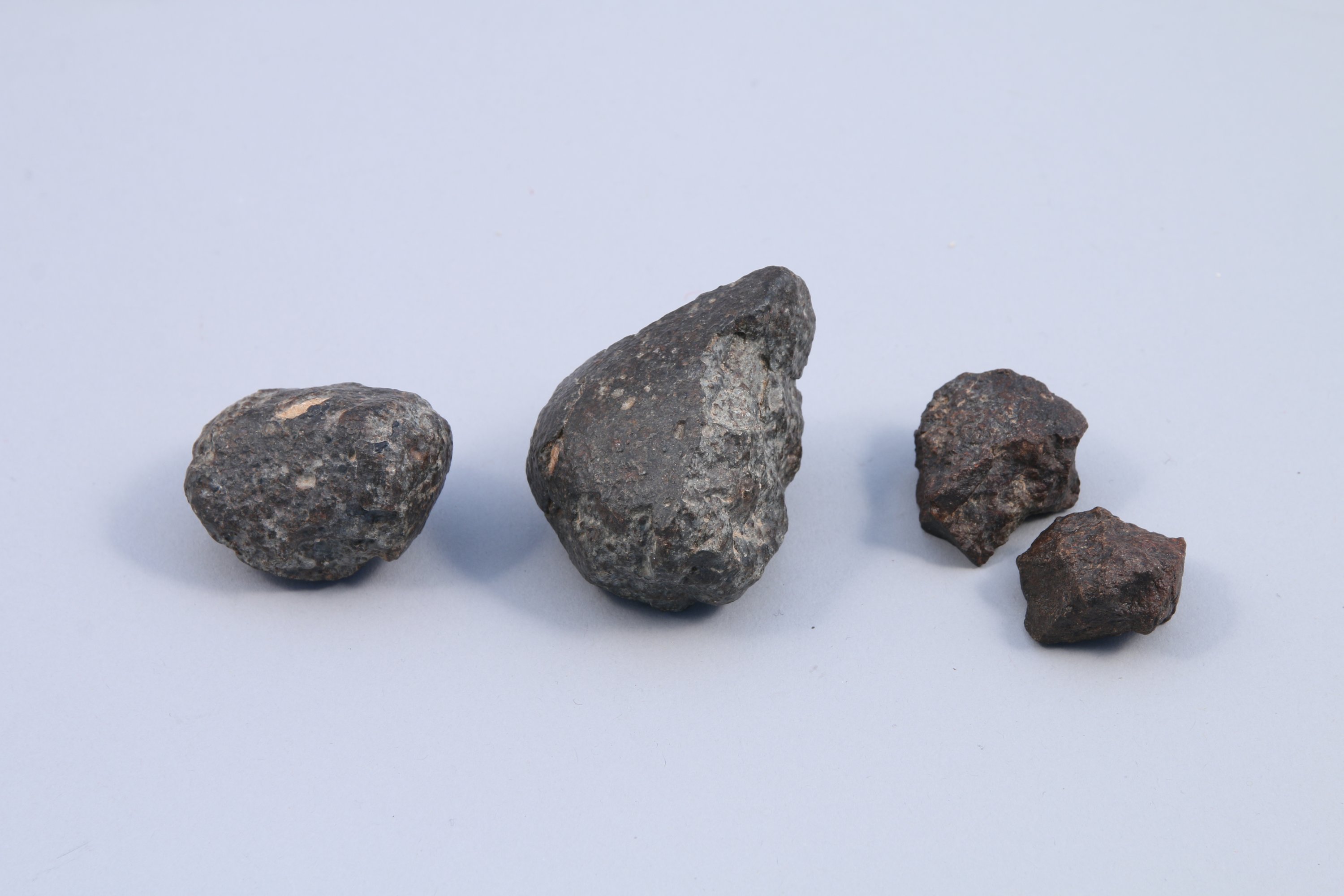 RÉUNION de quatre MÉTÉORITES MAROCAINES entières à belles croûtes de fusion :