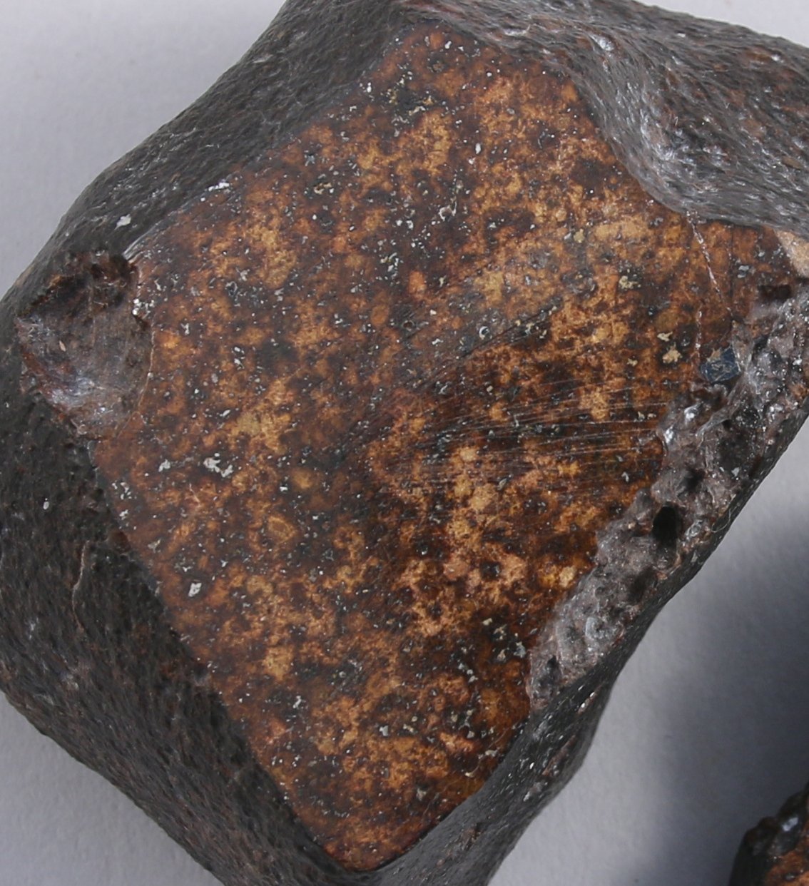 CHONDRITE LL5/LL6. Une MÉTÉORITE, matrice intérieure couleur " marron chocolat ", jolie croûte de fusion. Une face coupée et polie.