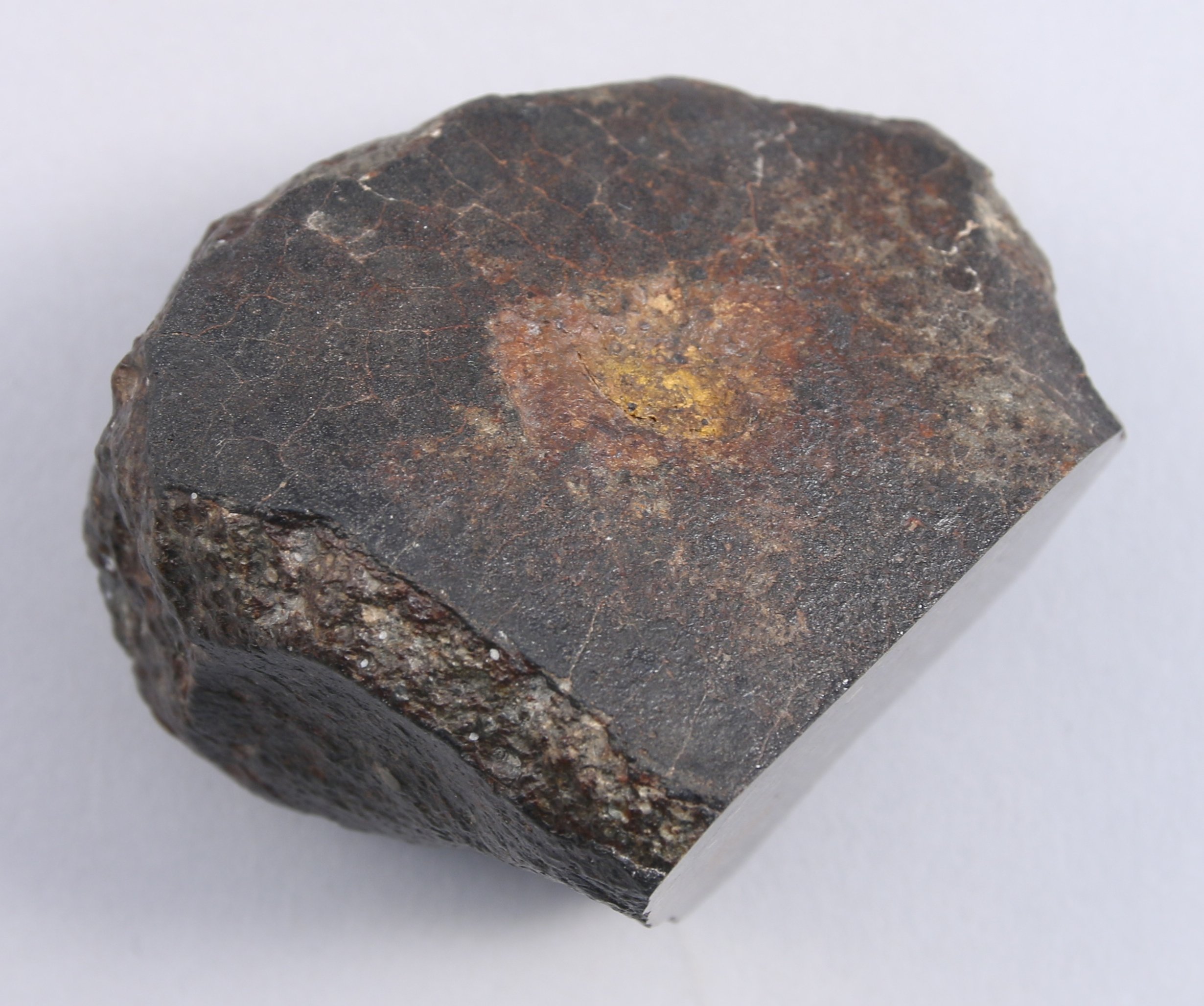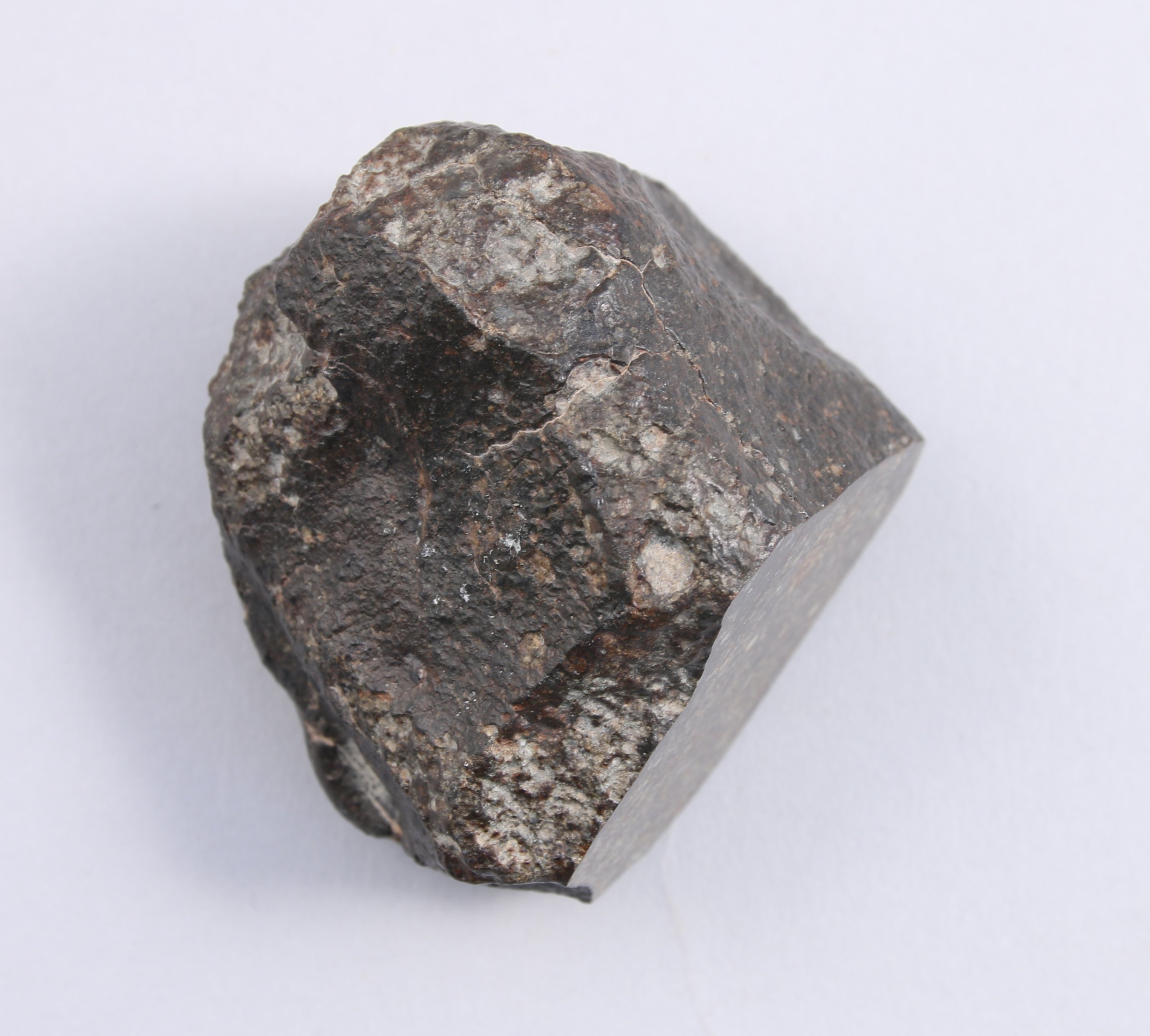 CHONDRITE L4/5. Une MÉTÉORITE, matrice riche en chondre, jolie croute de fusion, une face coupée.