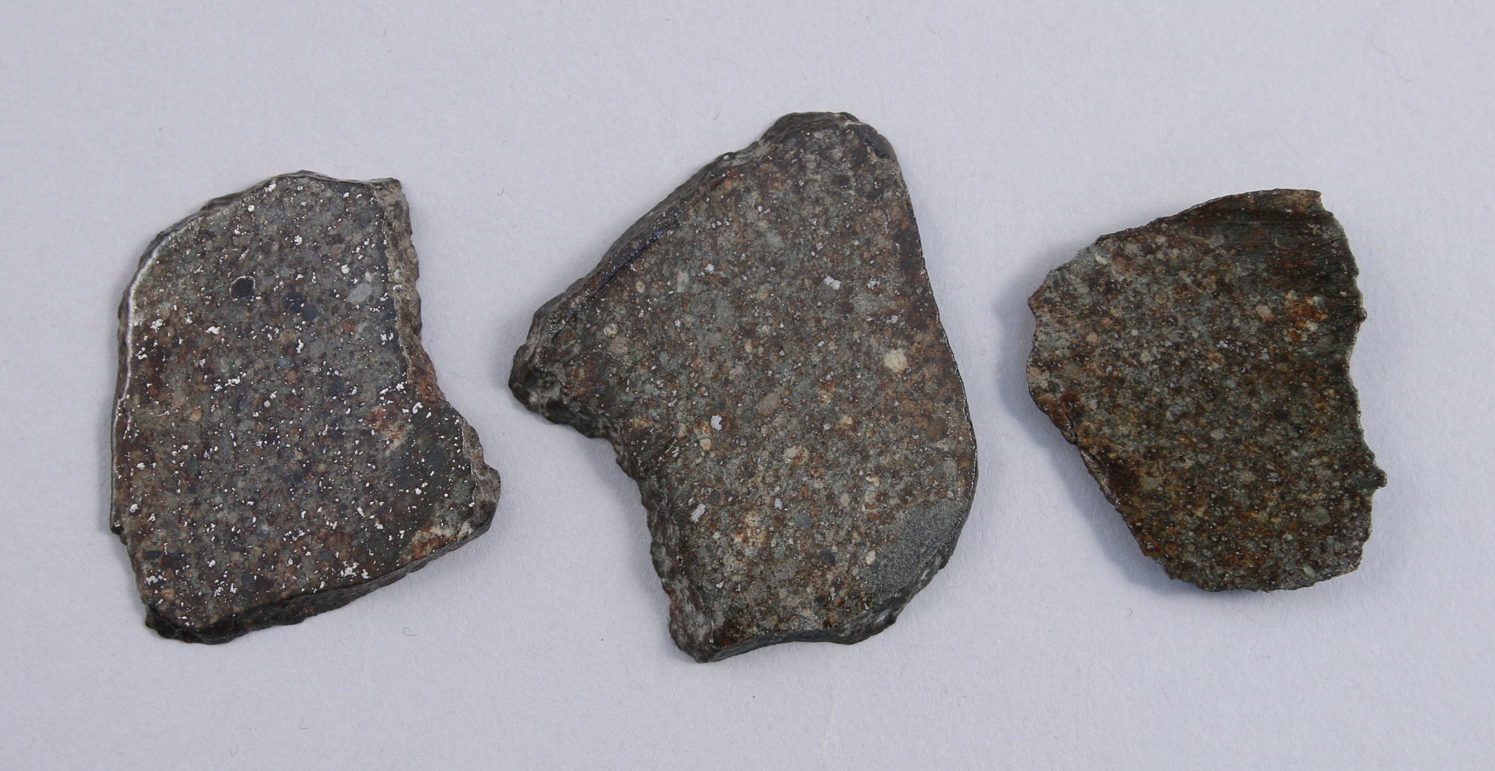 - CHONDITRE L4/5. Deux TRANCHES de MÉTÉORITE. Une face polie et légèrement vernie, une face naturelle. Stade de choc S3. Grade de vieillissement W2. Poids total : 23,2g. (9,2 g. la première ; 14 g. la seconde).