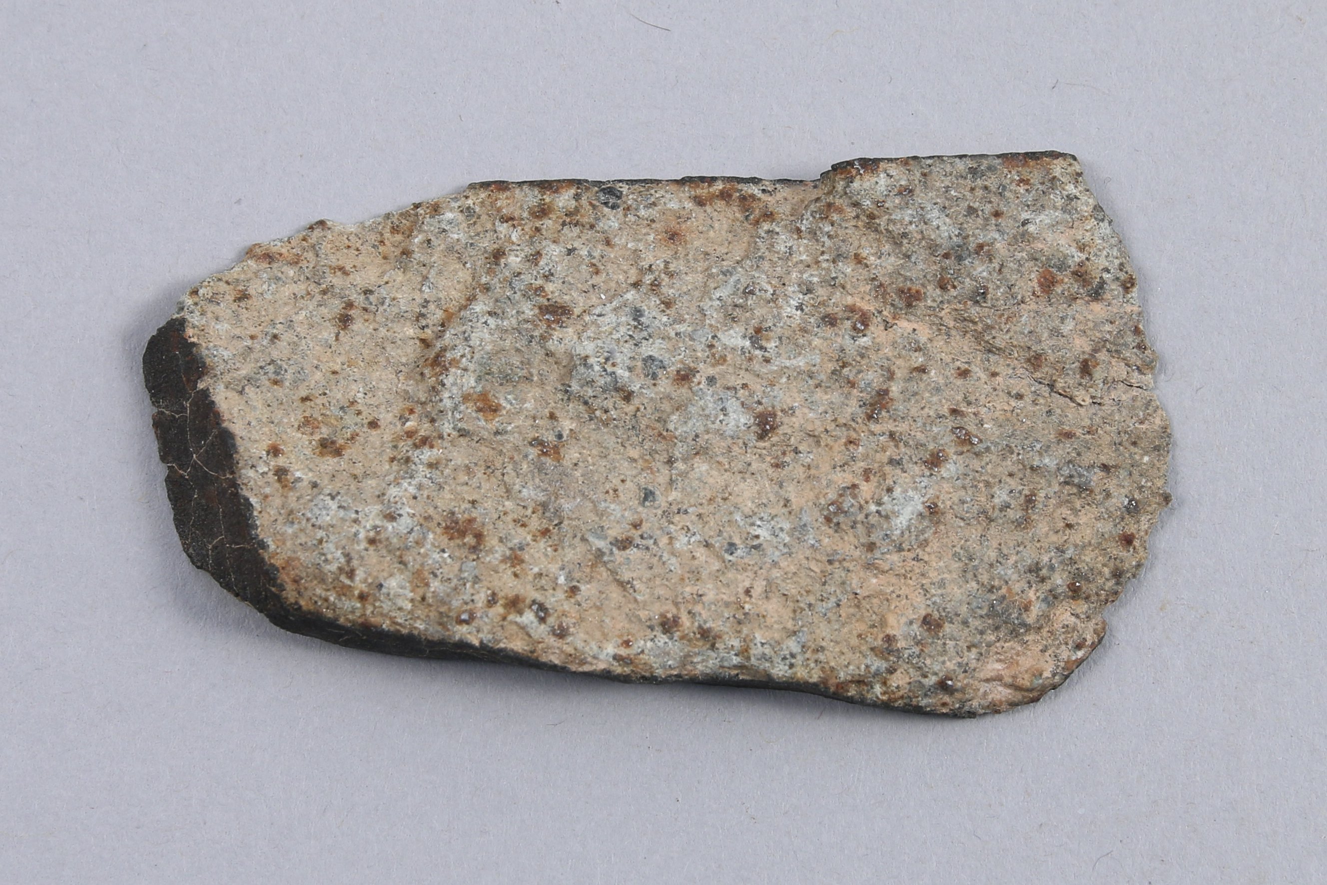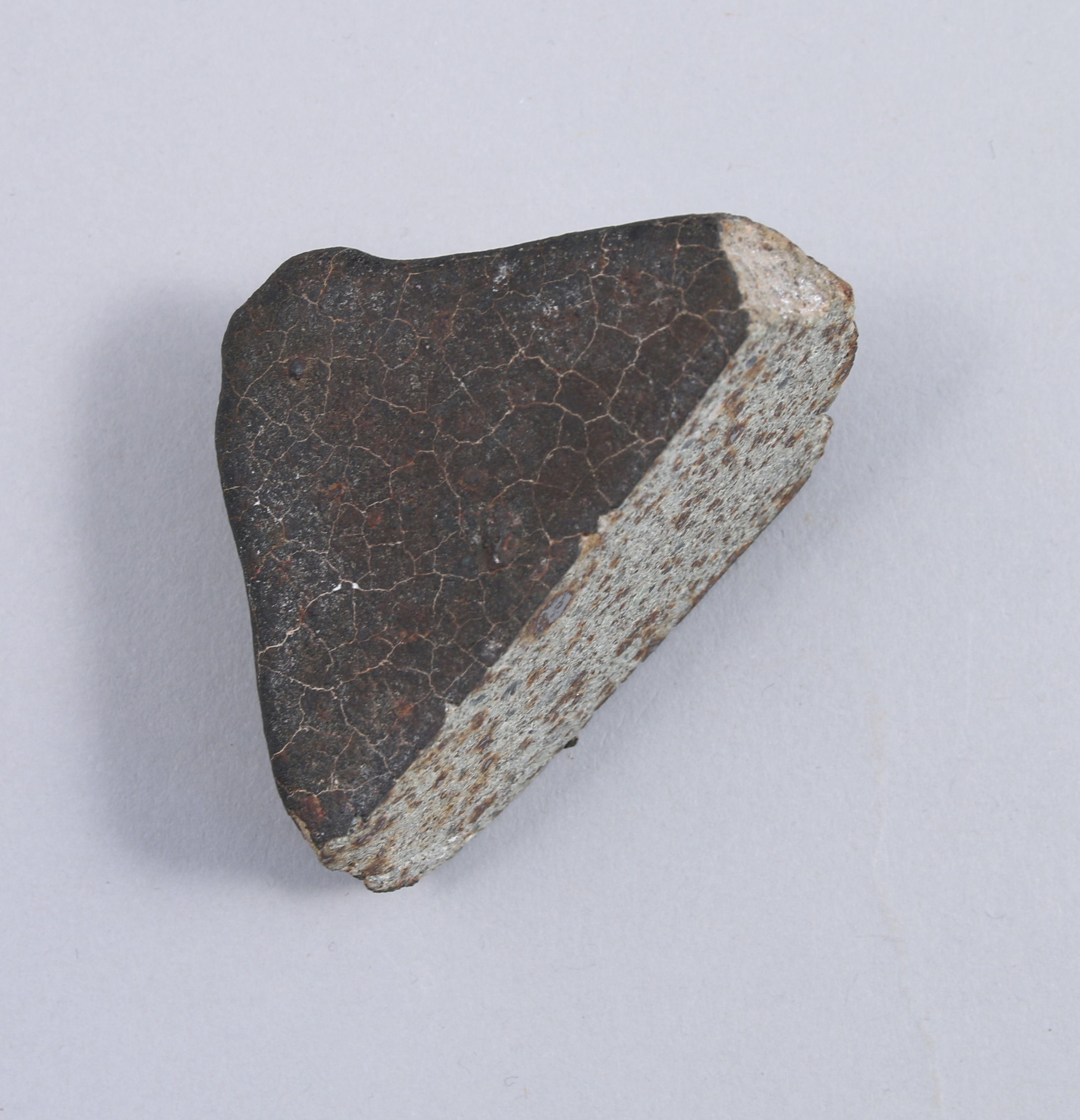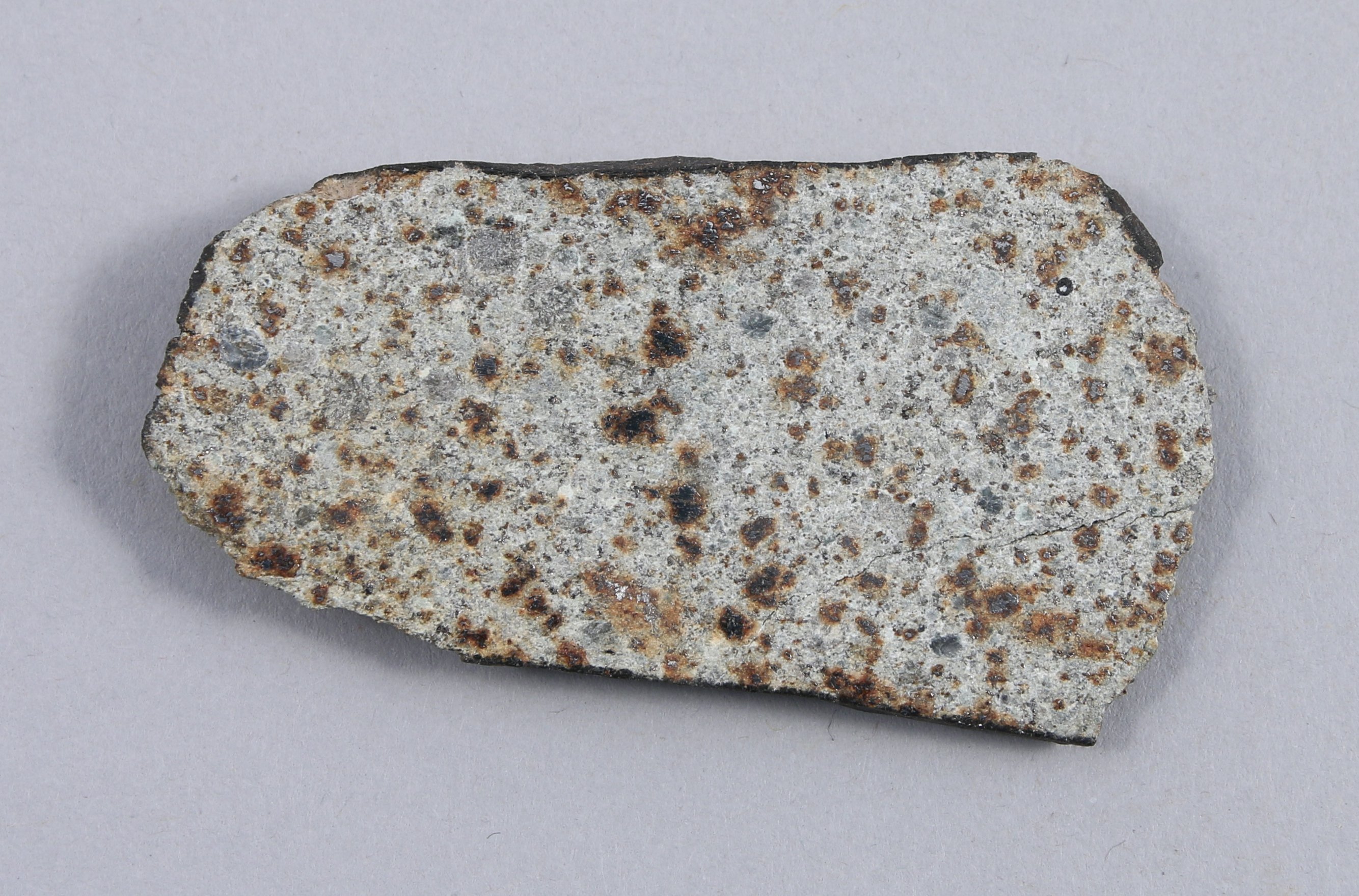 CHONDRITE L4/L5. Une MÉTÉORITE à matrice intérieure blanche, et ses grains de ferronickel, jolie croûte de fusion. Une face coupée et polie.