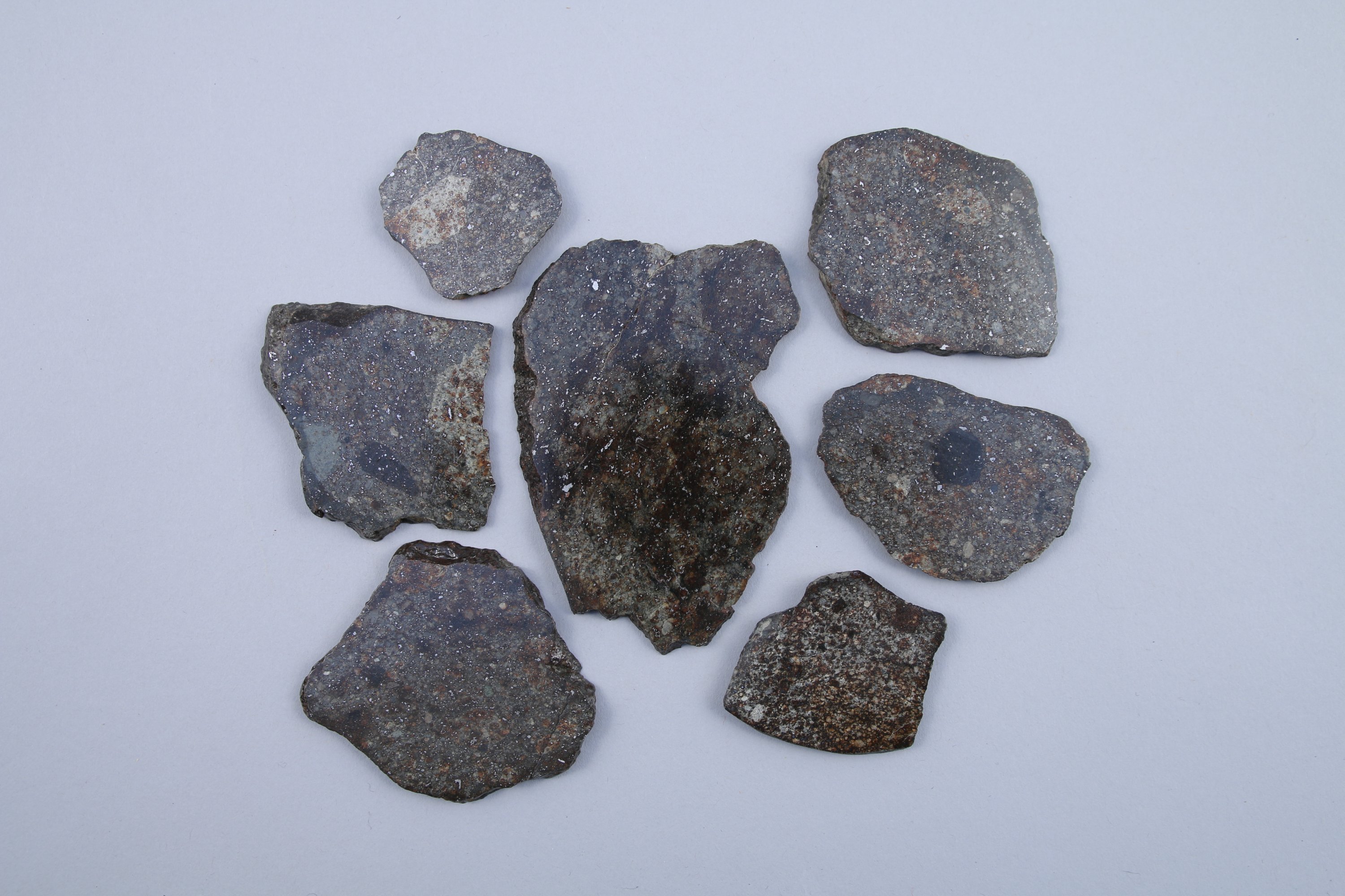 CHONDRITE H ou L. LOT de SEPT TRANCHES de MÉTÉORITE de la " Ceinture d'Astéroïdes " entre Mars et Jupiter. Une face polie et légèrement vernie, l'autre naturelle.