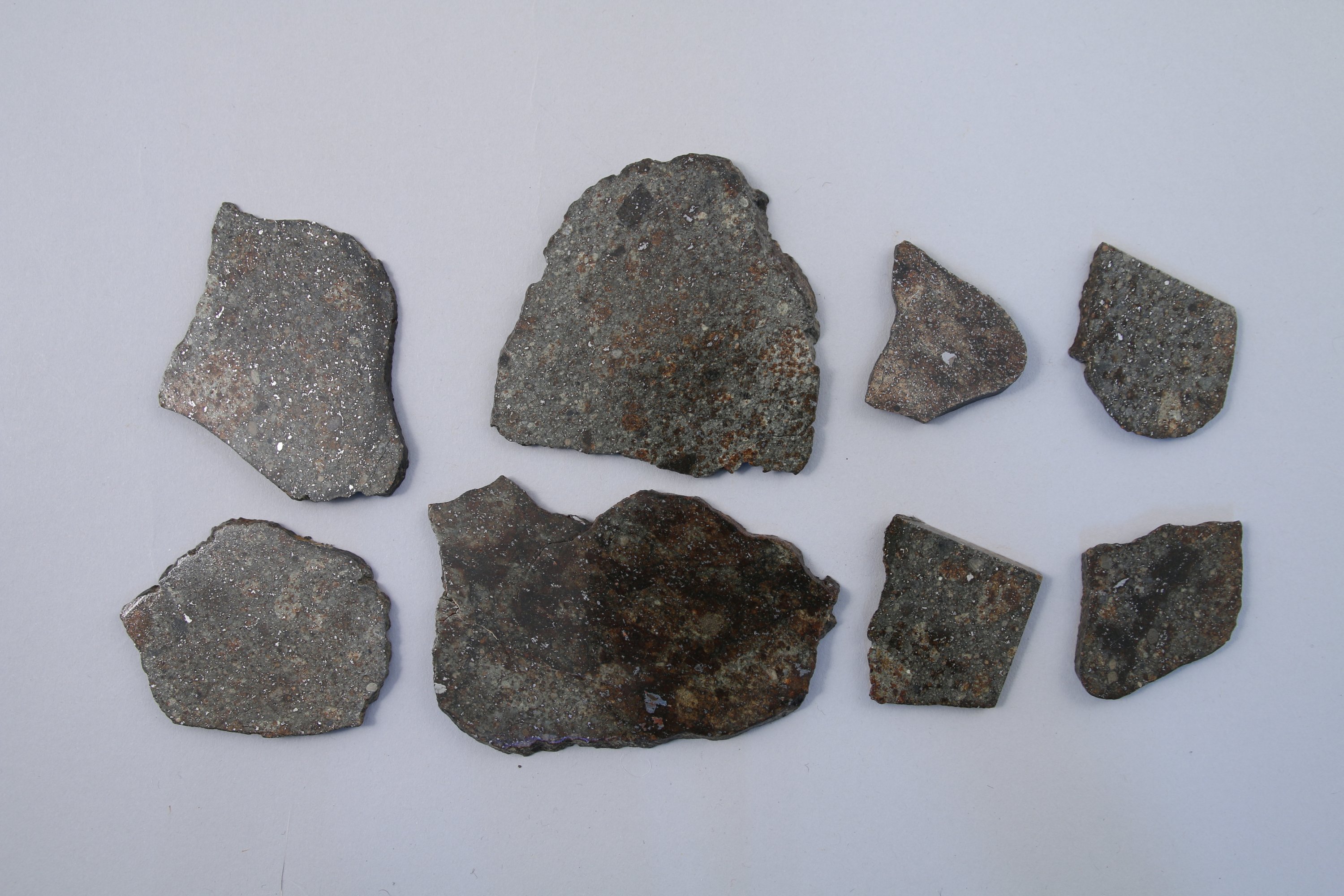 CHONDRITE H ou L. LOT de HUIT TRANCHES de MÉTÉORITE de la " Ceinture d'Astéroïdes " entre Mars et Jupiter. Une face polie et légèrement vernie, l'autre naturelle.