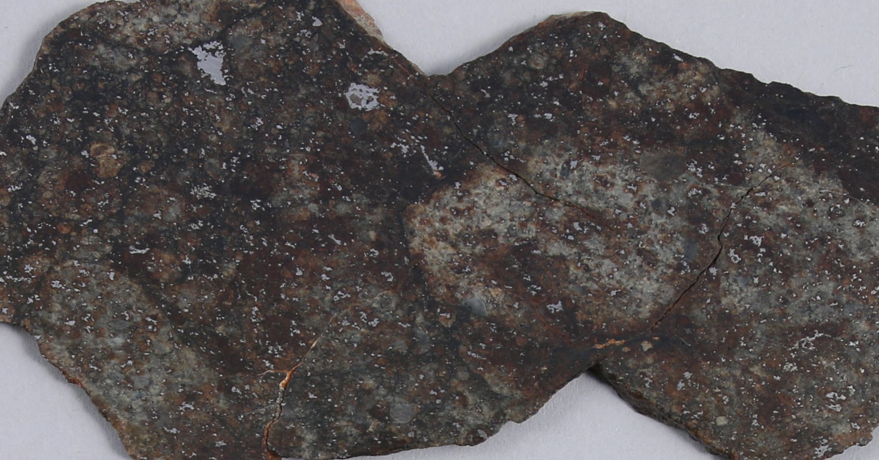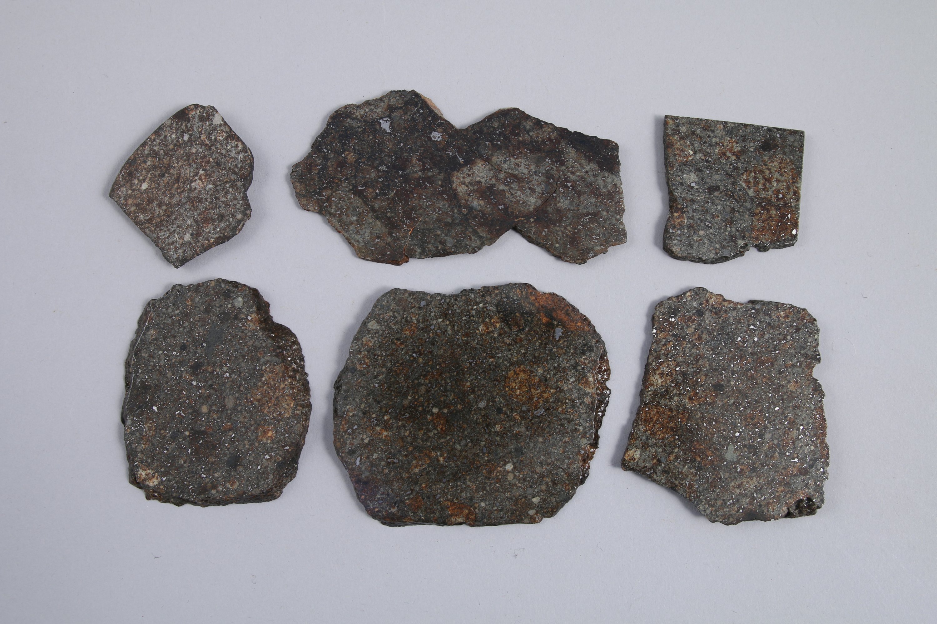 CHONDRITE H ou L. LOT de SIX TRANCHES de MÉTÉORITE de la " Ceinture d'Astéroïdes " entre Mars et Jupiter. Une face polie et légèrement vernie, l'autre naturelle.