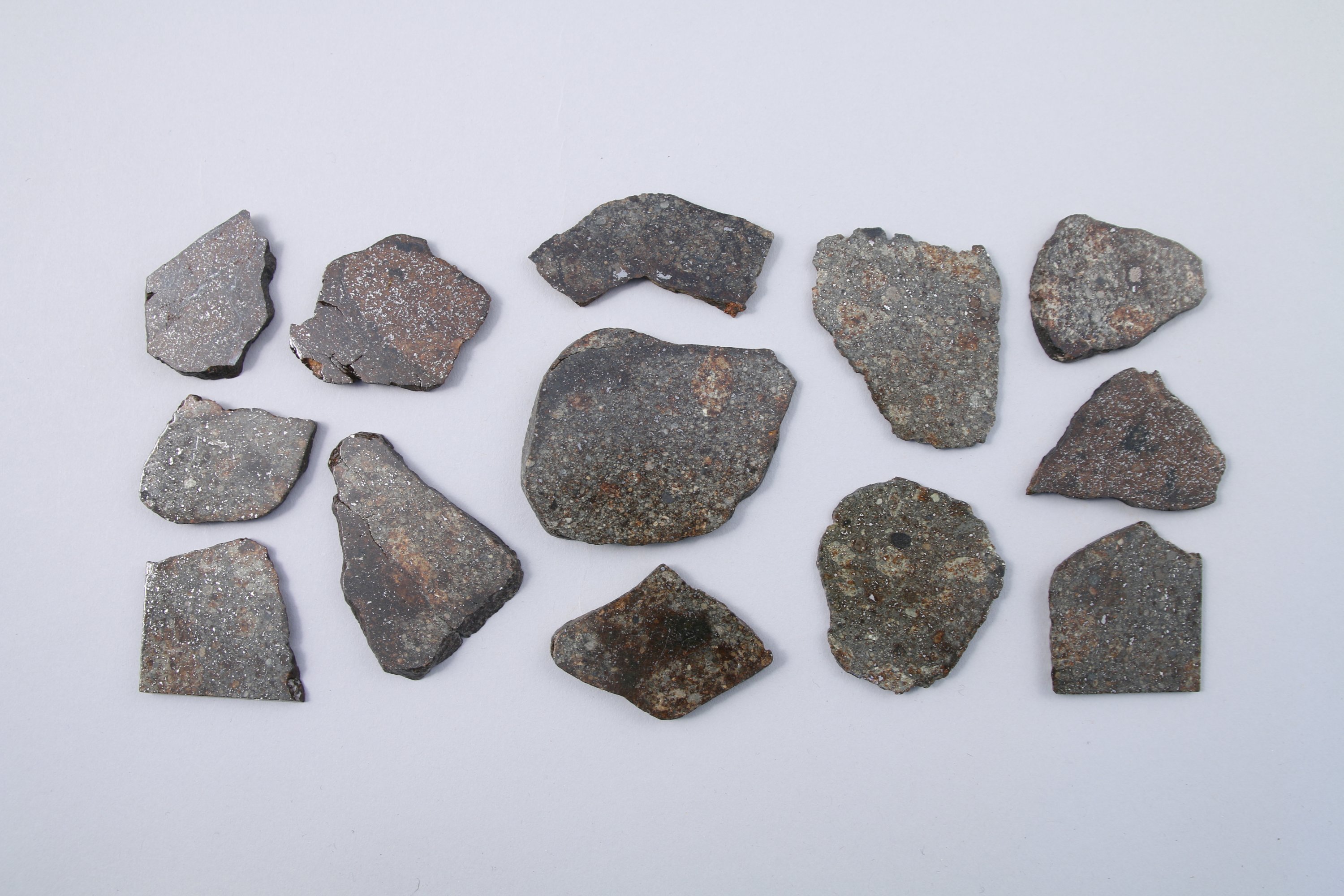 CHONDRITE H ou L. LOT de TREIZE TRANCHES de MÉTÉORITE de la " Ceinture d'Astéroïdes " entre Mars et Jupiter. Une face polie et légèrement vernie, l'autre naturelle.