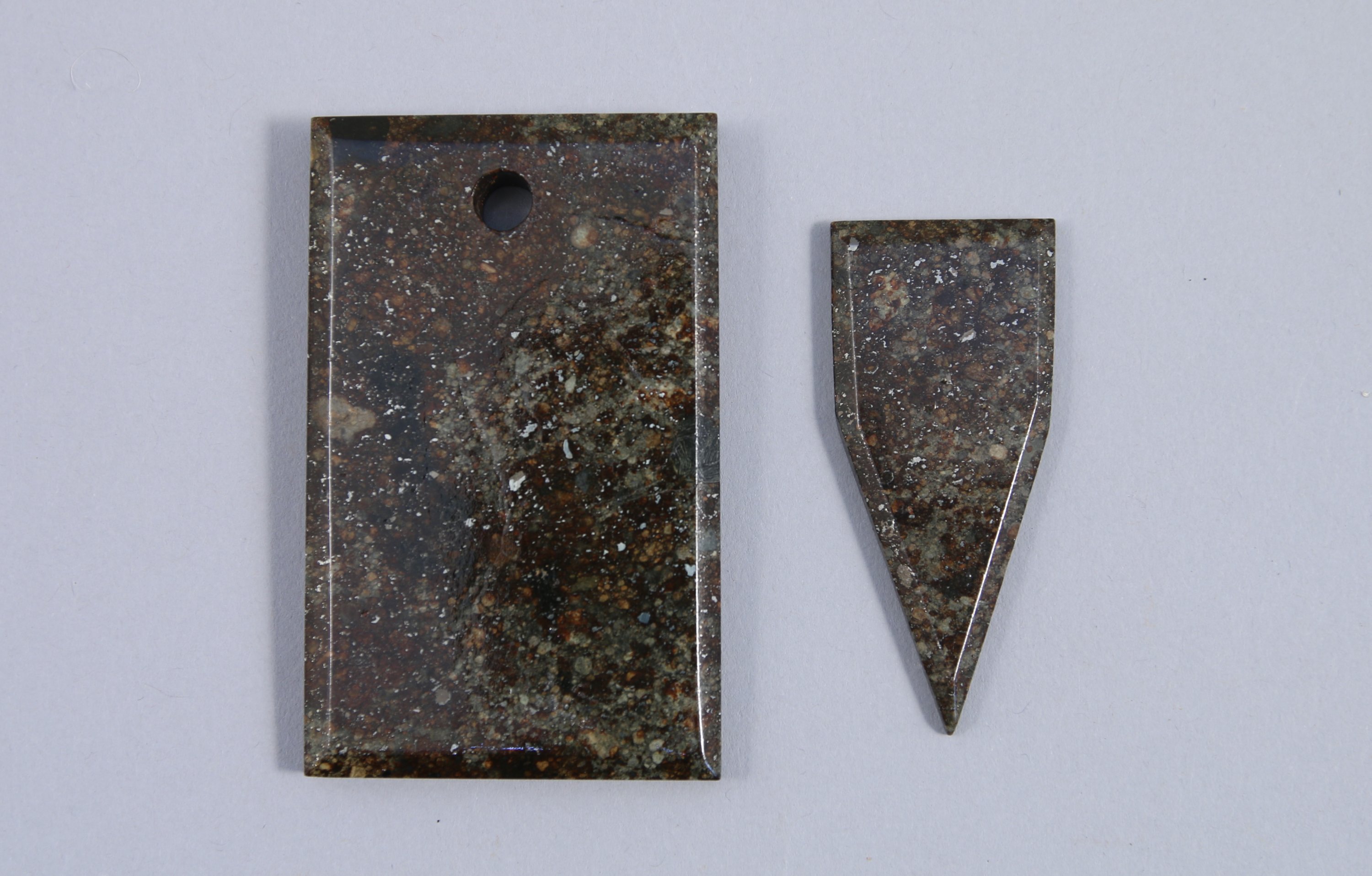 CHONDRITE H ou L. LOT de DEUX CRÉATIONS ORIGINALES en MÉTÉORITE facettée de la " Ceinture d'Astéroïdes " entre Mars et Jupiter. Faces polies et légèrement vernies.
