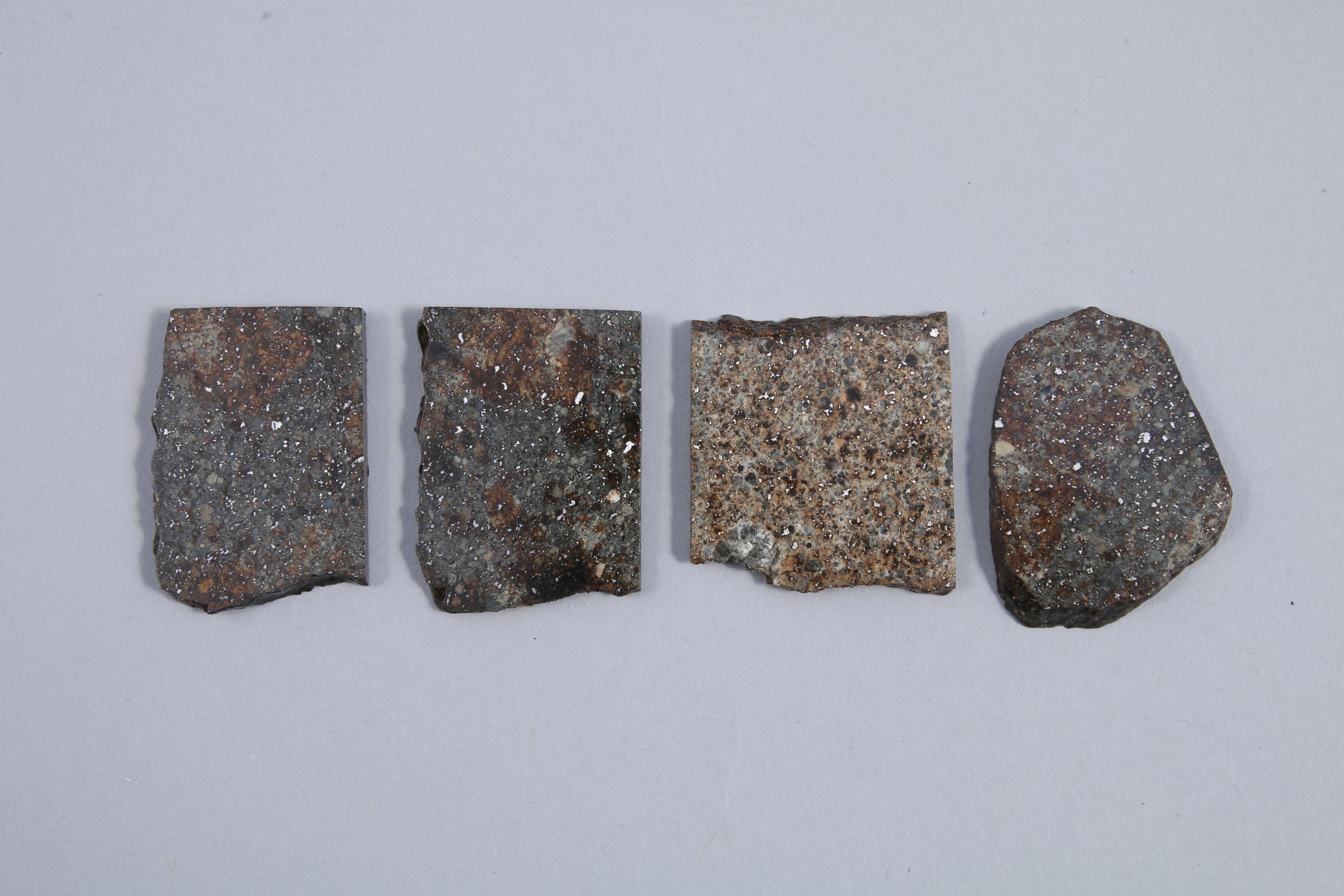 Joint : CHONDRITE H ou L. ENSEMBLE de 4 TRANCHES de MÉTÉORITE de la " Ceinture d'Astéroïdes " entre Mars et Jupiter. Faces polies et légèrement vernies et une face naturelle. 54,6 g.