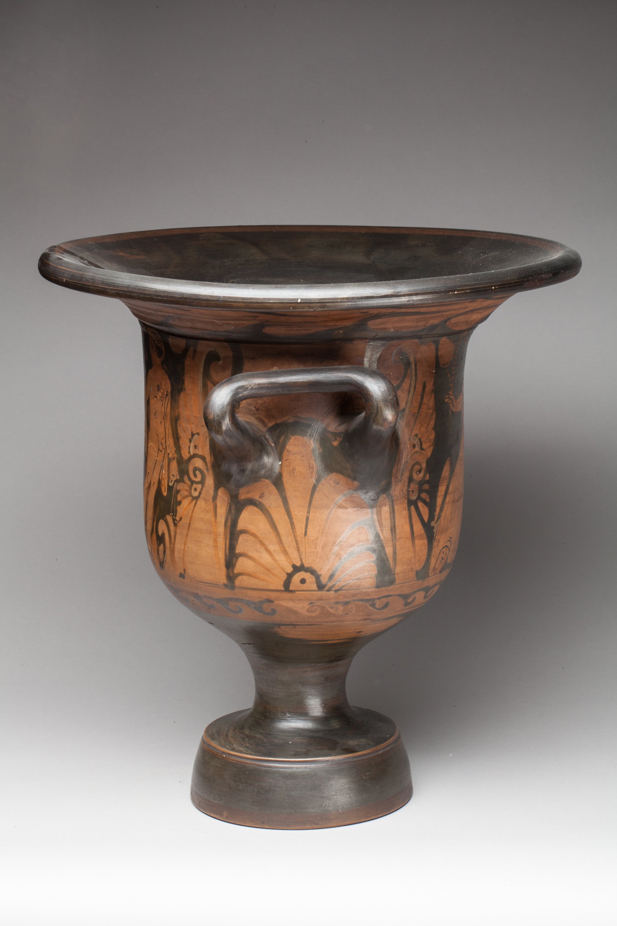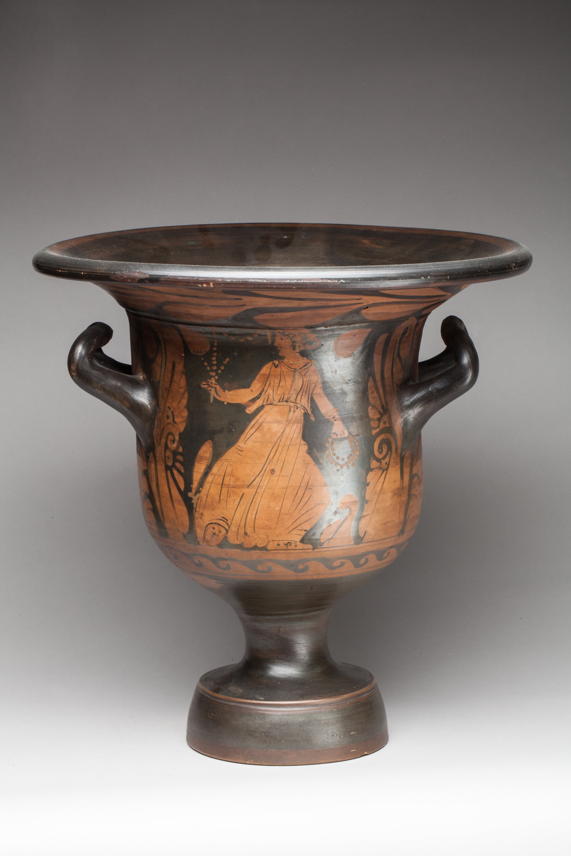 IMPORTANT CRATÈRE en cloche. Céramique à figure rouge. Sur une face : Dyonisos et une Ménade, autre face jeune femme tenant une couronne dans la main gauche, un rameau dans la main droite, entre les scènes, palmettes, sous le col et à la base feuilles de laurier et languettes. Bel état.