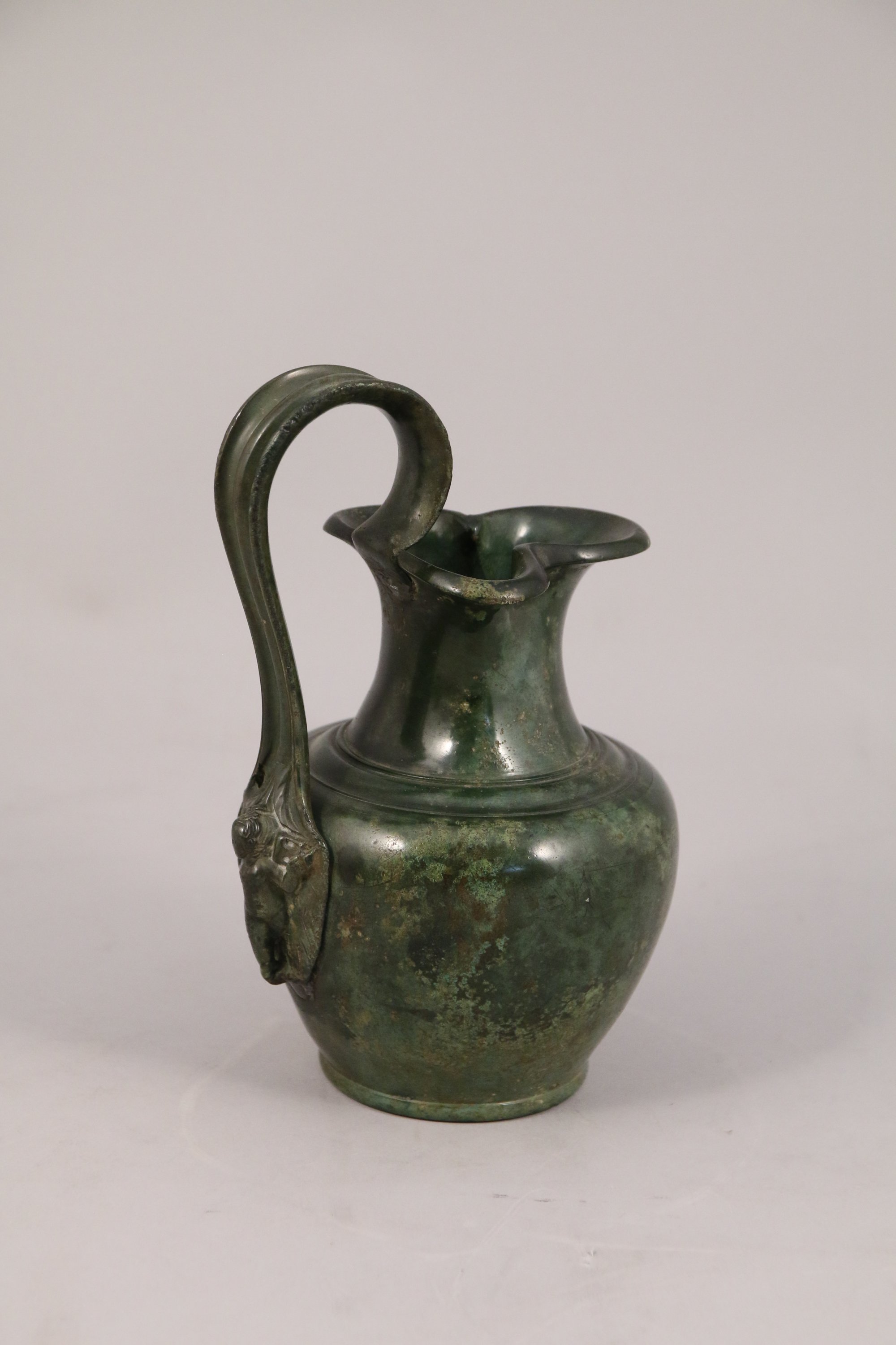 OENOCHOE à bec trèflé. Bronze à patine verte lissée due à un séjour dans l'eau. L'anse est ornée à sa base d'un génie ailé de la mort qui tient dans sa main droite un glaive et dans sa main gauche un vase à anse. Le fond comporte en creux des cercles.