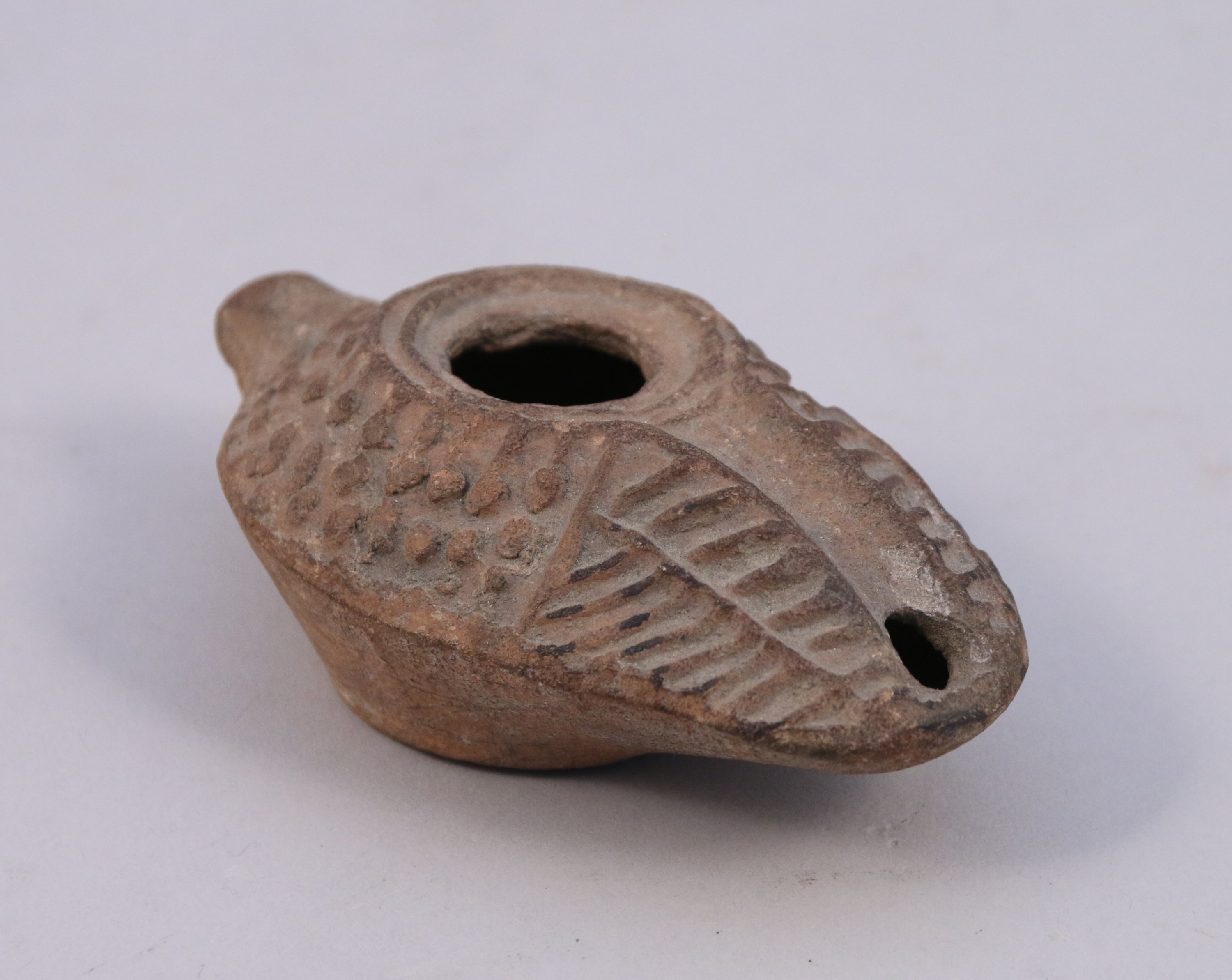 JOINT : LAMPE À HUILE en terre cuite. Syro-Palestinienne VIe-Xe siècles. Long. 10,5 cm.