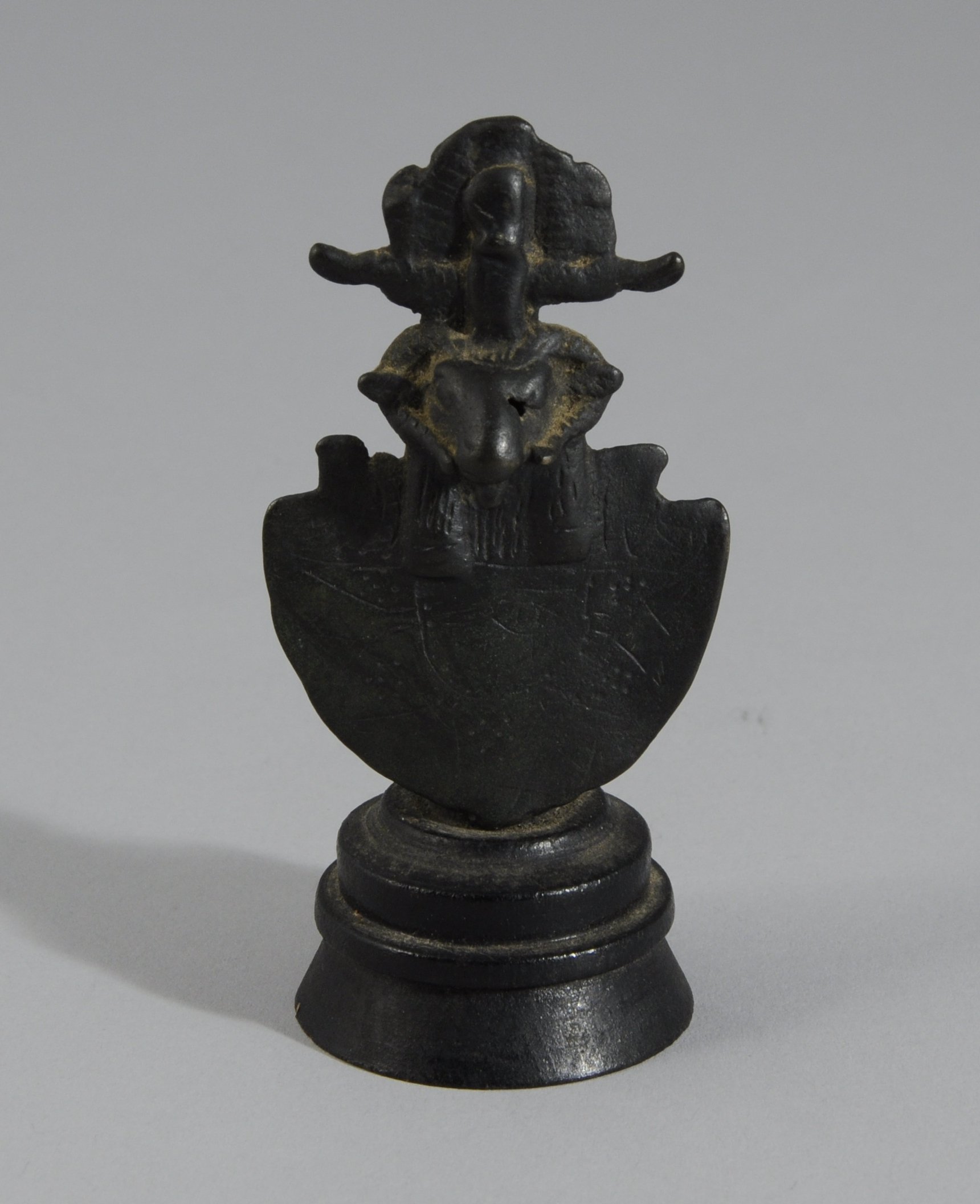 PENDENTIF D'ÉGIDE KNOUM. Bronze à patine verte, décor gravé, coiffé de la couronne composite.