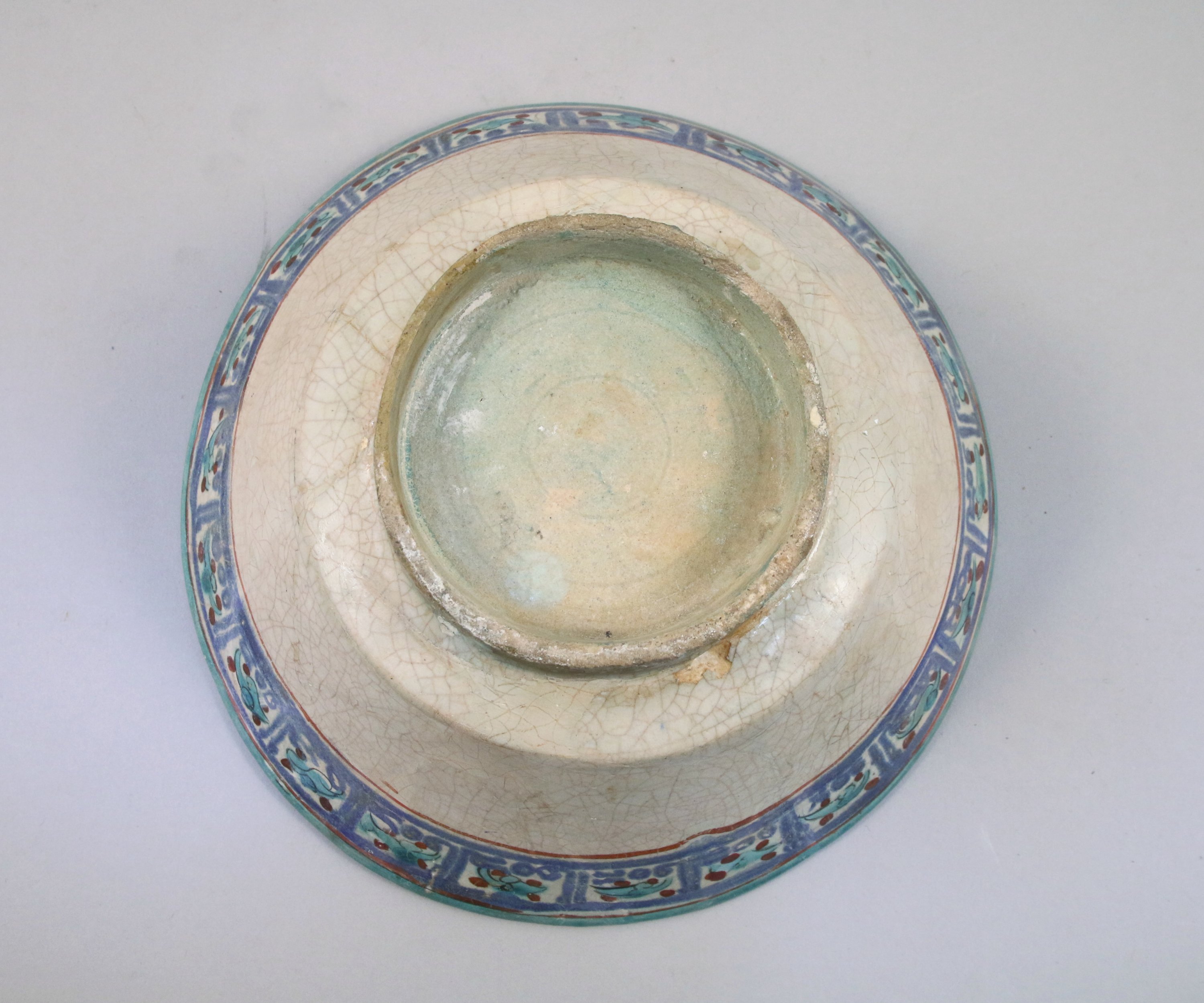 COUPE de type seldjoukide. Céramique siliceuse hémisphérique à décor de pseudo-inscriptions bleues et cercles turquoises.