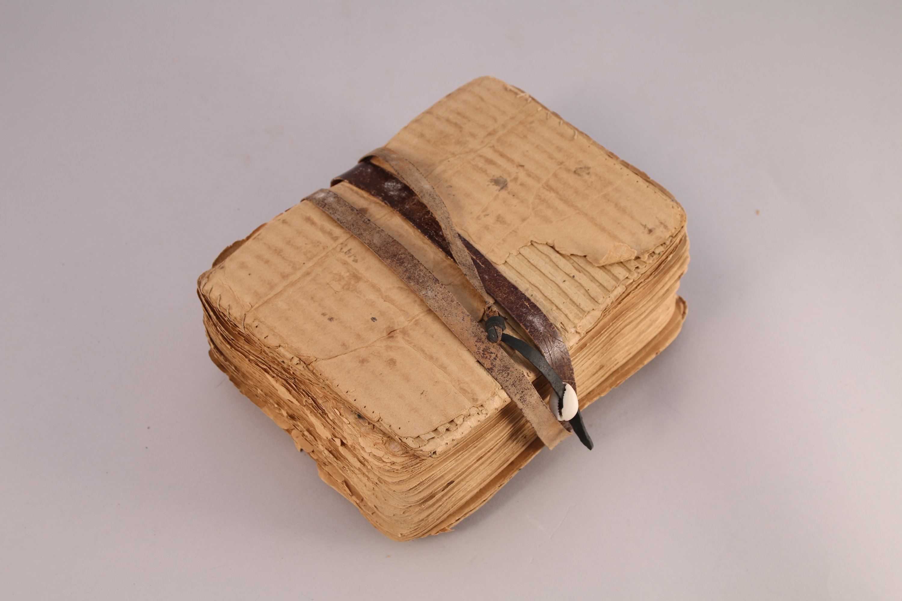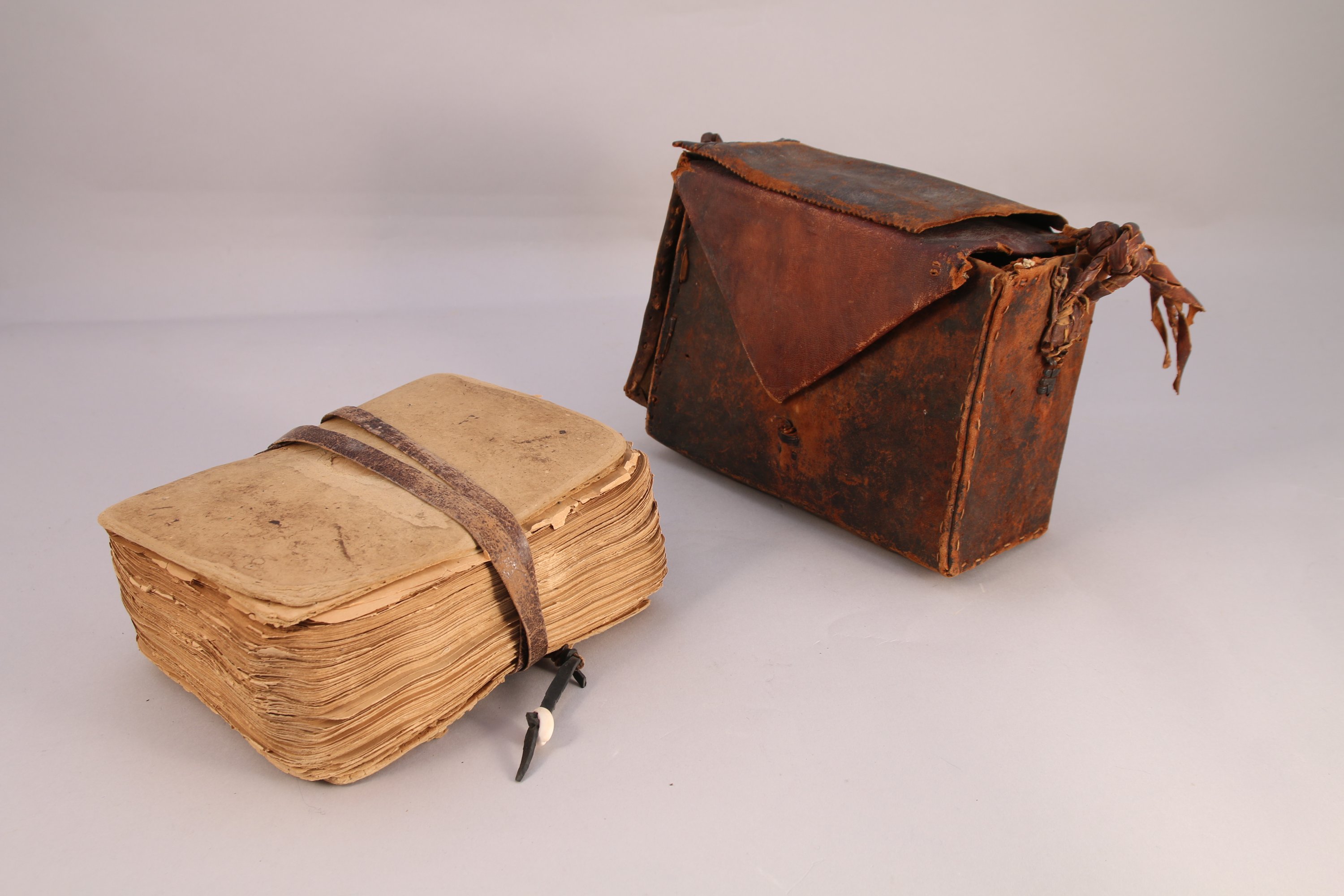 Reliure : Haut. 21, Larg. 17 cm. (pages manquantes, dans le désordre, déchirures, taches, restaurations, sacoche décousue)
