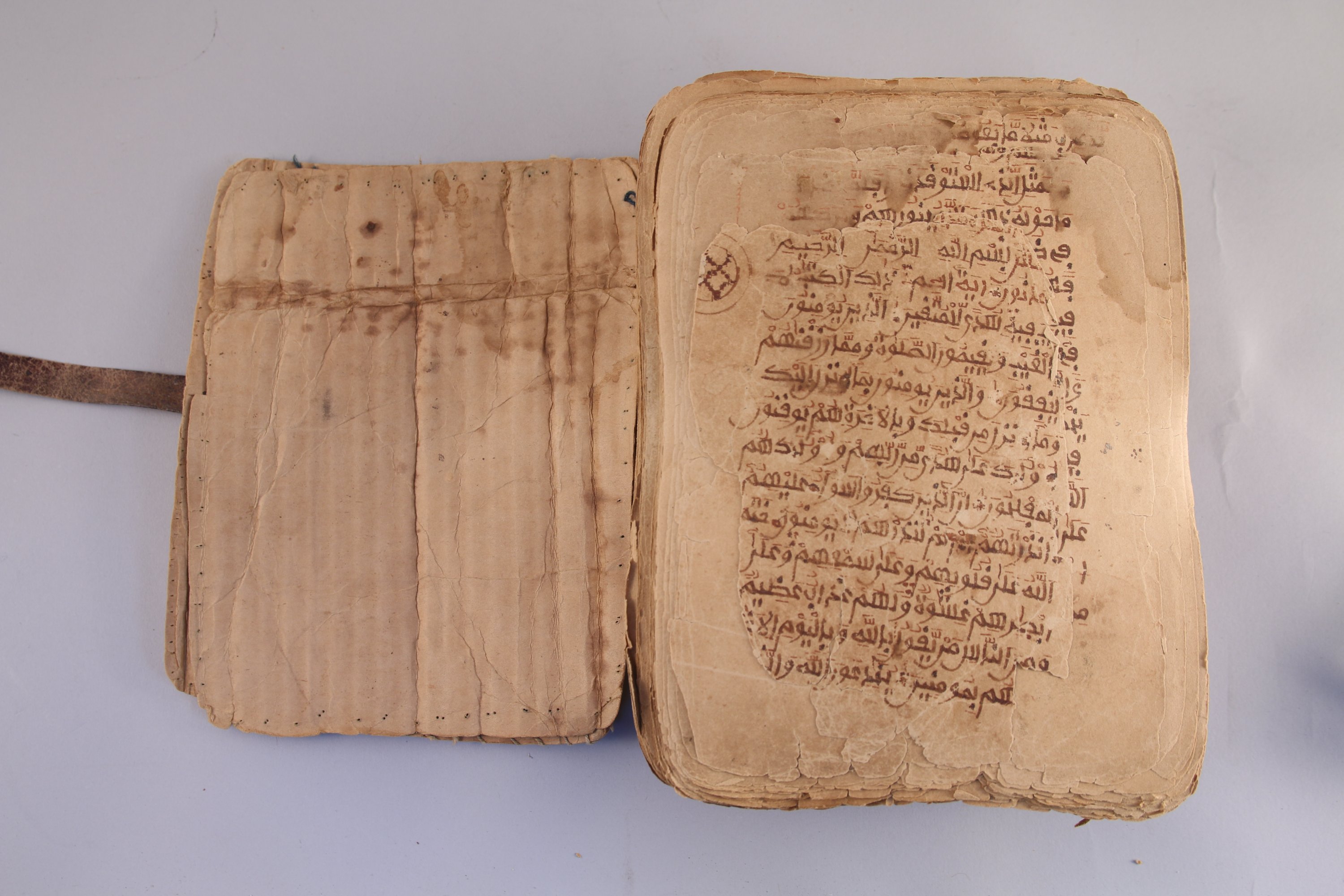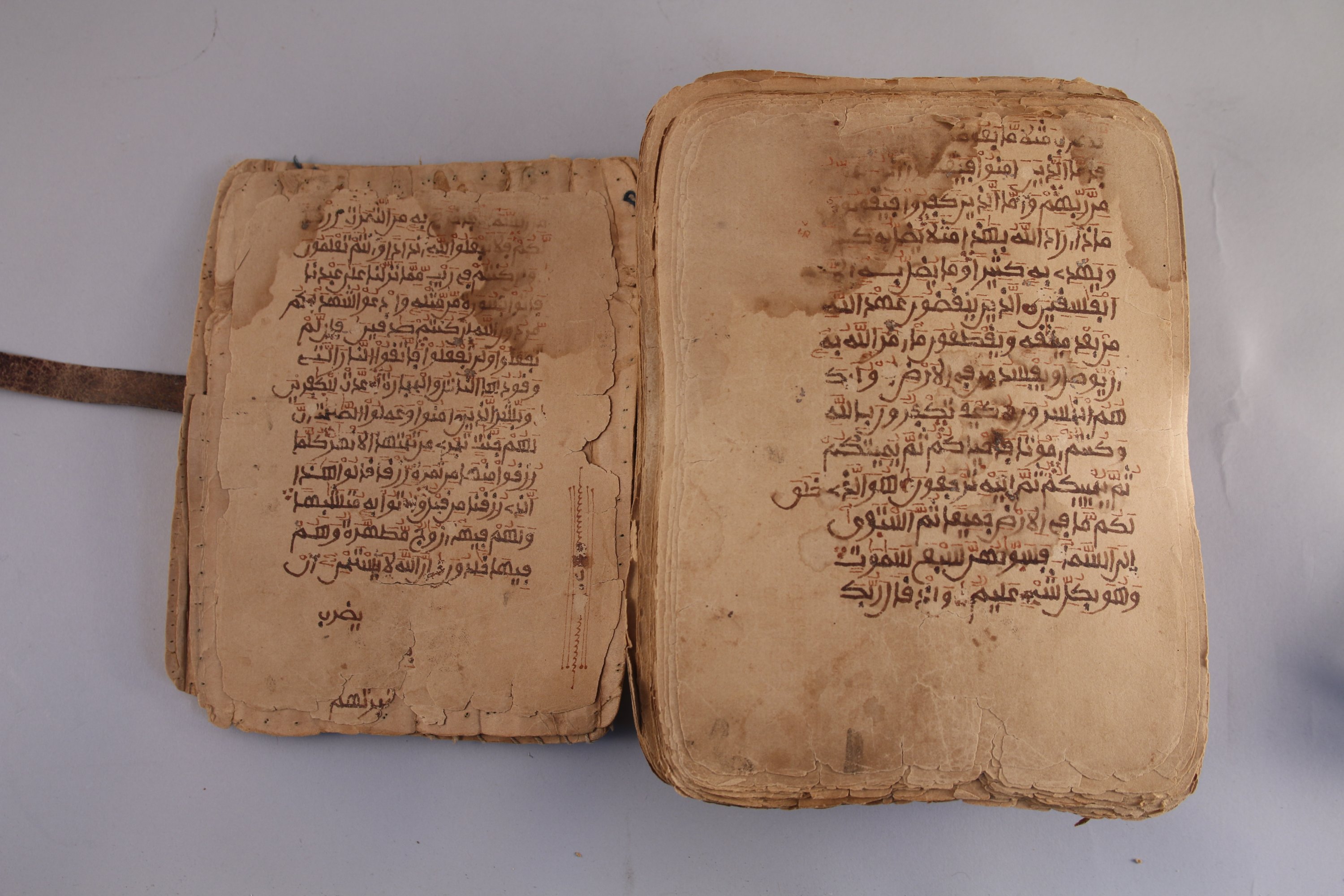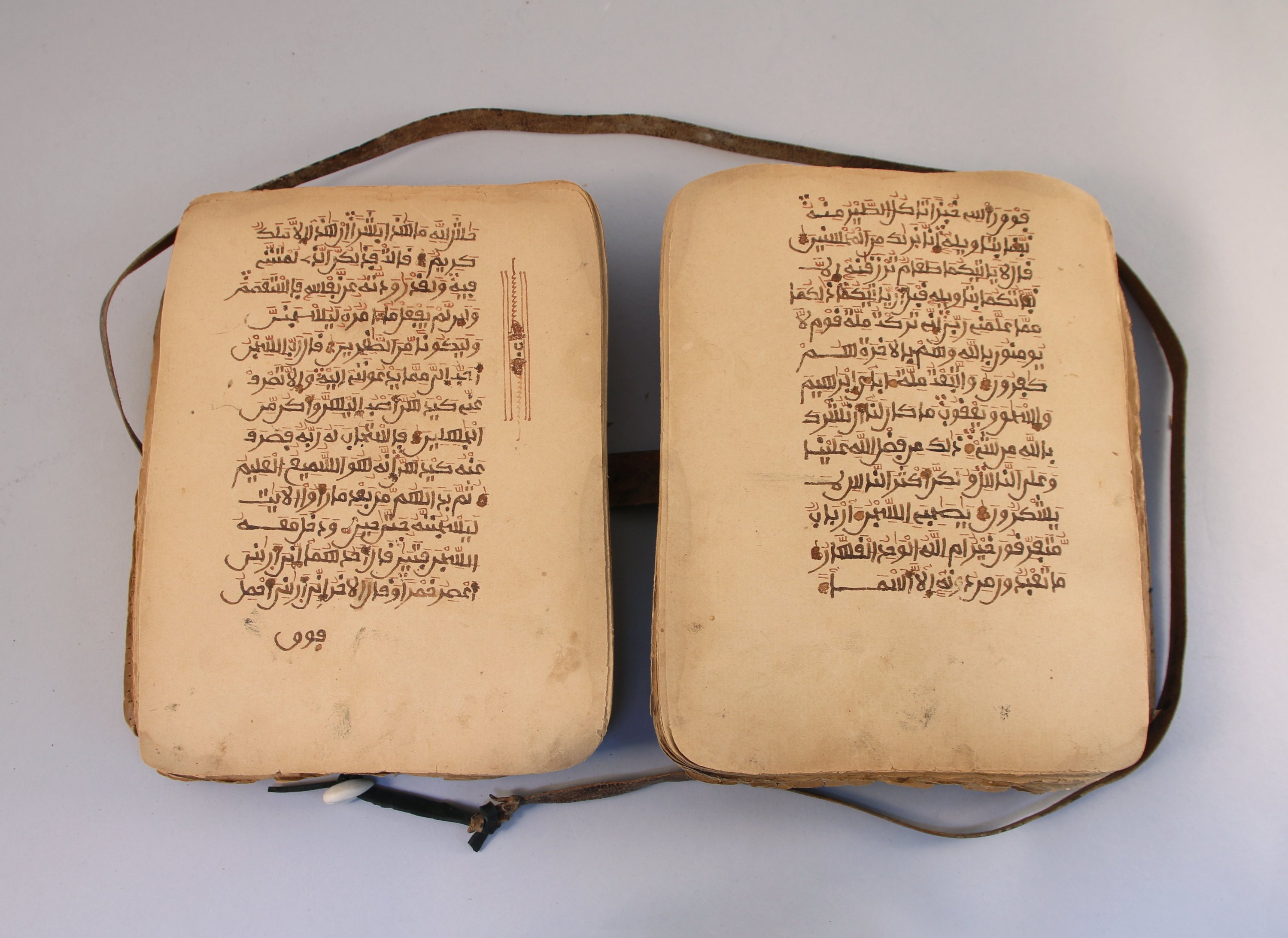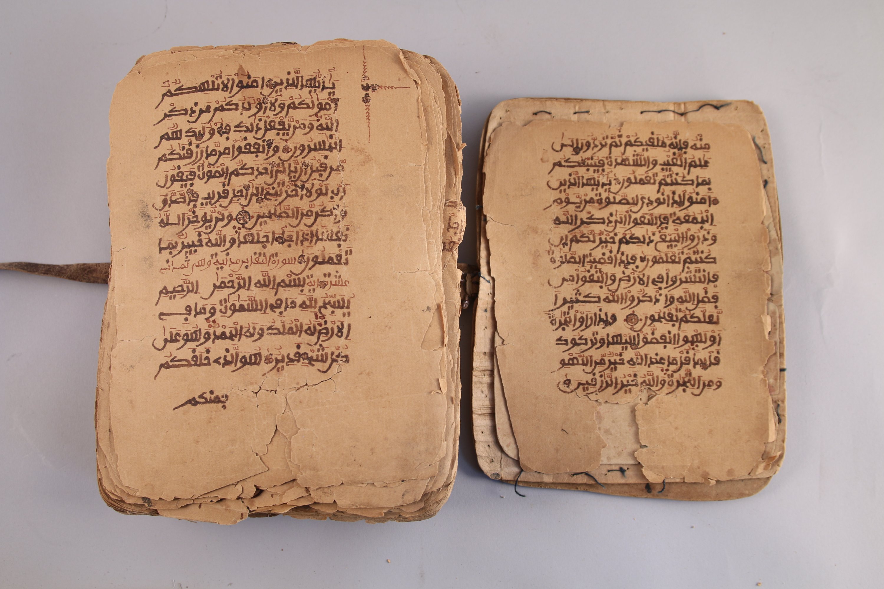 CORAN. Manuscrit incomplet sur papier de 13 lignes de texte par page en arabe à l'encre sépia et rouge pour certains termes et caractères. Séparations de versets et ornements marginaux à l'encre polychrome. Un décor de panneau de croisillons à la fin de la Sourate 18. Feuillets volants entre deux plats cartonnés, l'un à lanière de cuir achevée par un cauris. Sacoche en cuir à rabat et lanière.