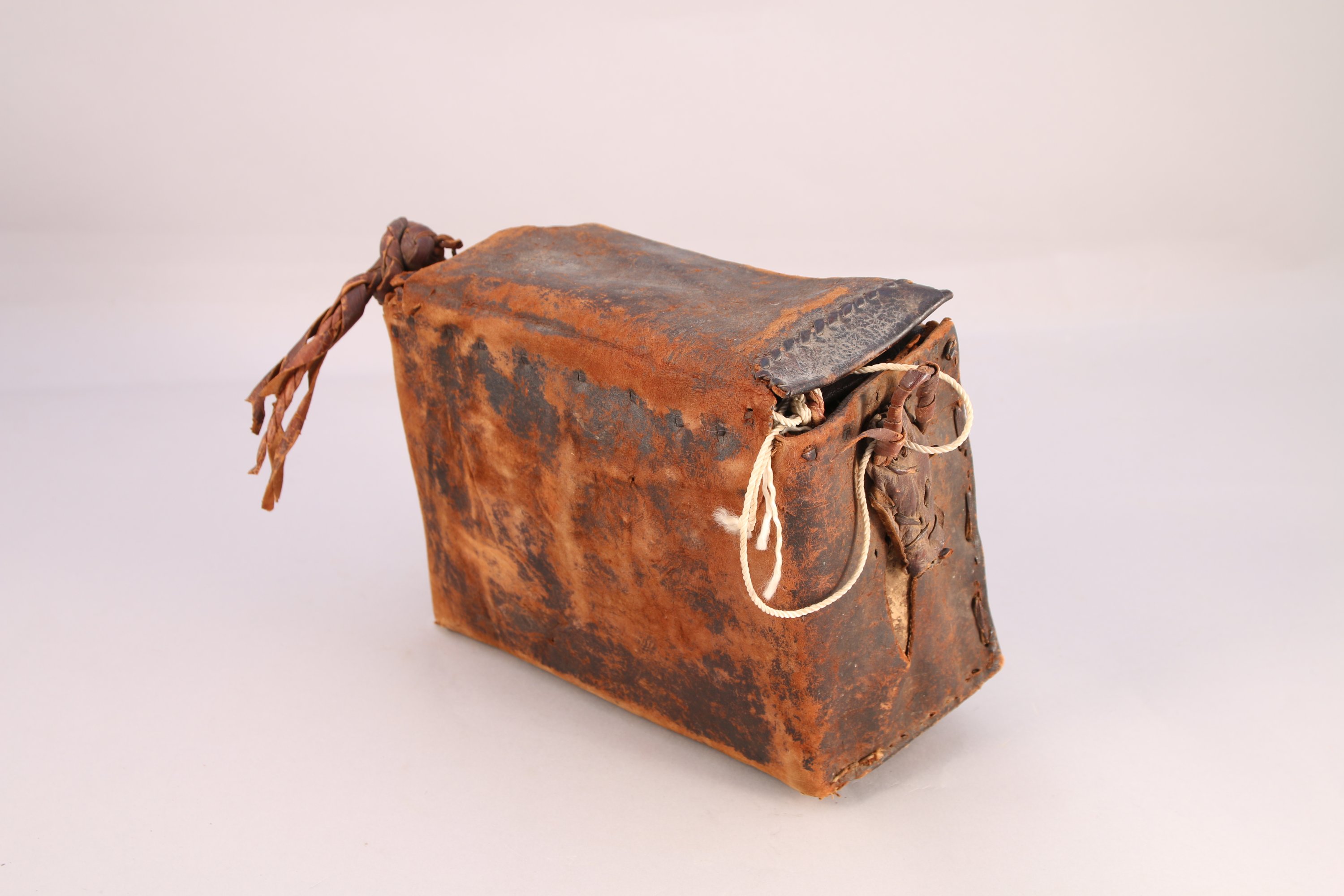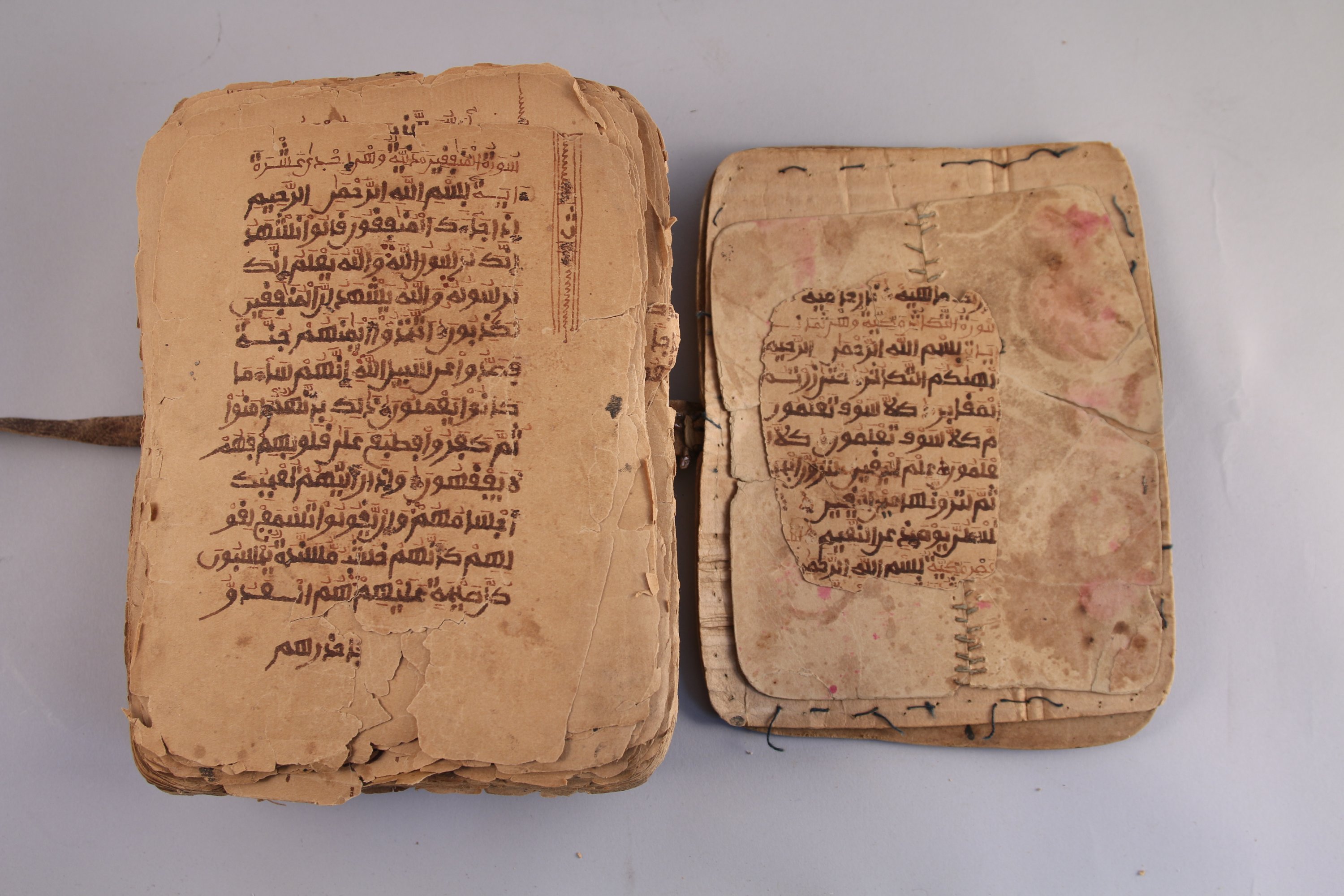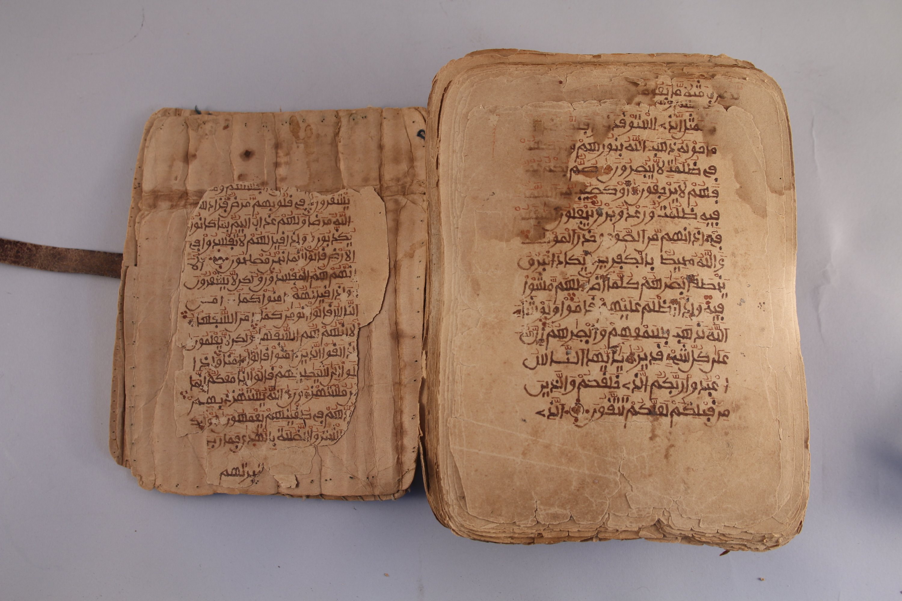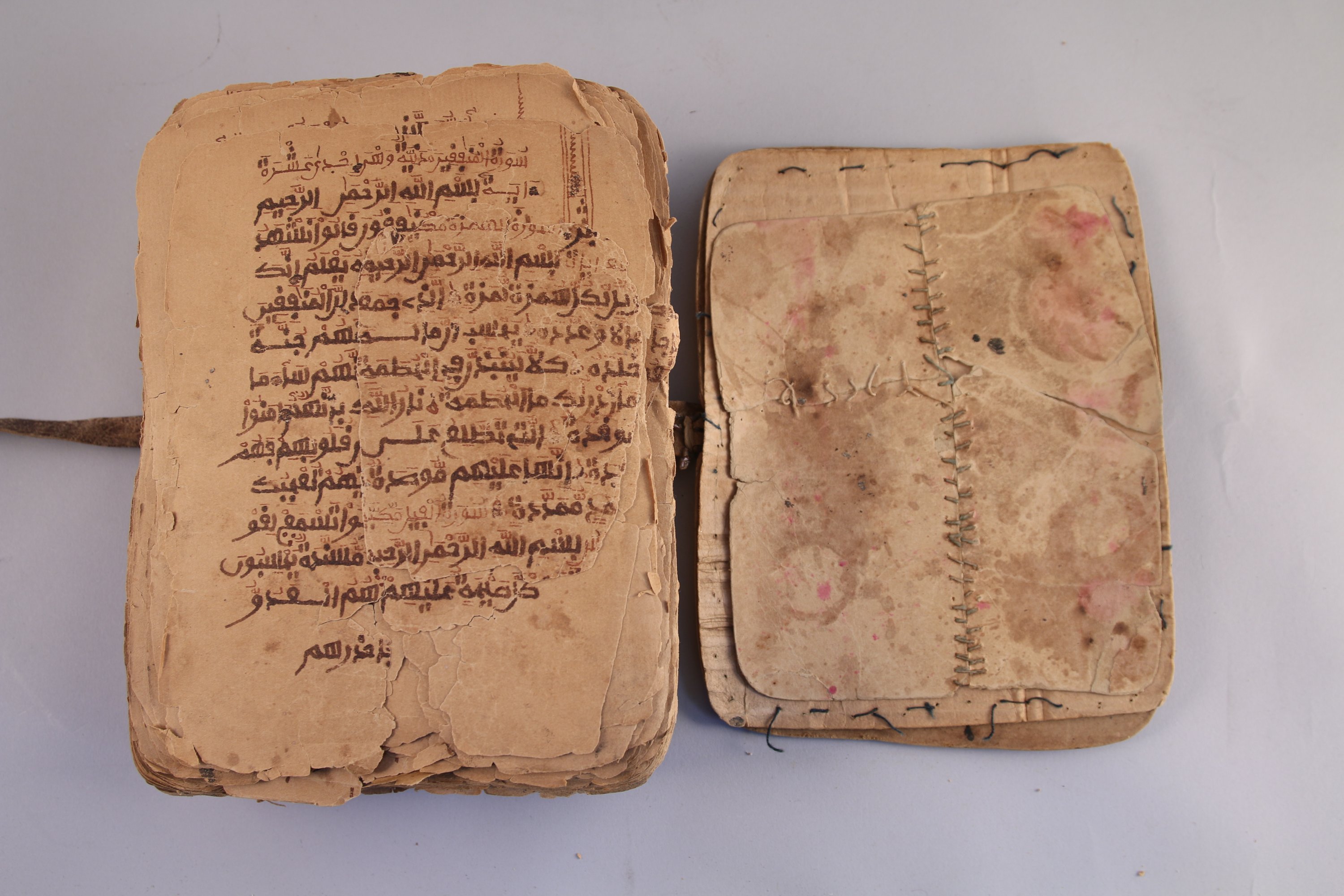 CORAN. Manuscrit incomplet sur papier de 13 lignes de texte par page en arabe à l'encre sépia et rouge pour certains termes et caractères. Séparations de versets et ornements marginaux à l'encre polychrome. Un décor de panneau de croisillons à la fin de la Sourate 18. Feuillets volants entre deux plats cartonnés, l'un à lanière de cuir achevée par un cauris. Sacoche en cuir à rabat et lanière.