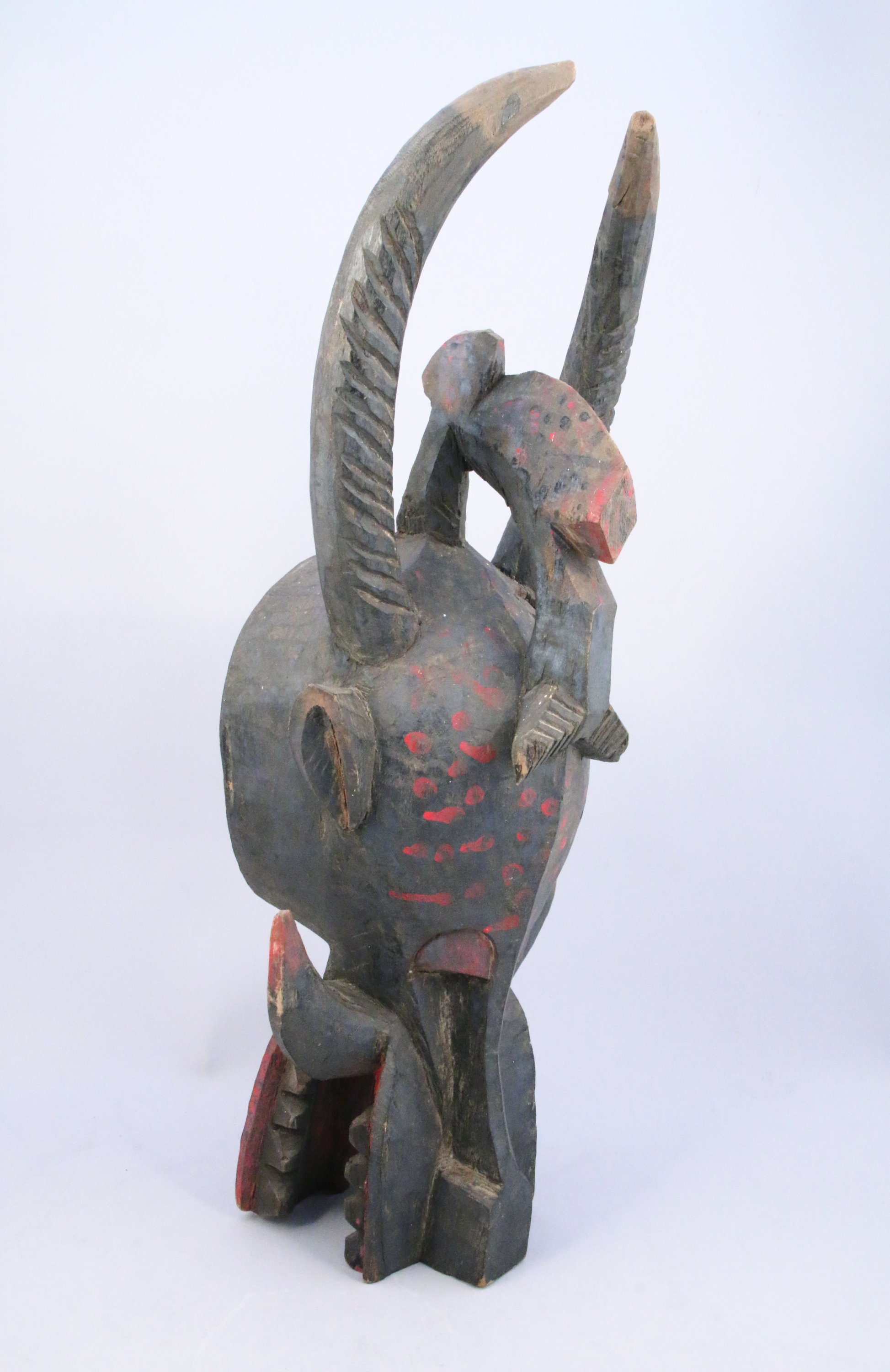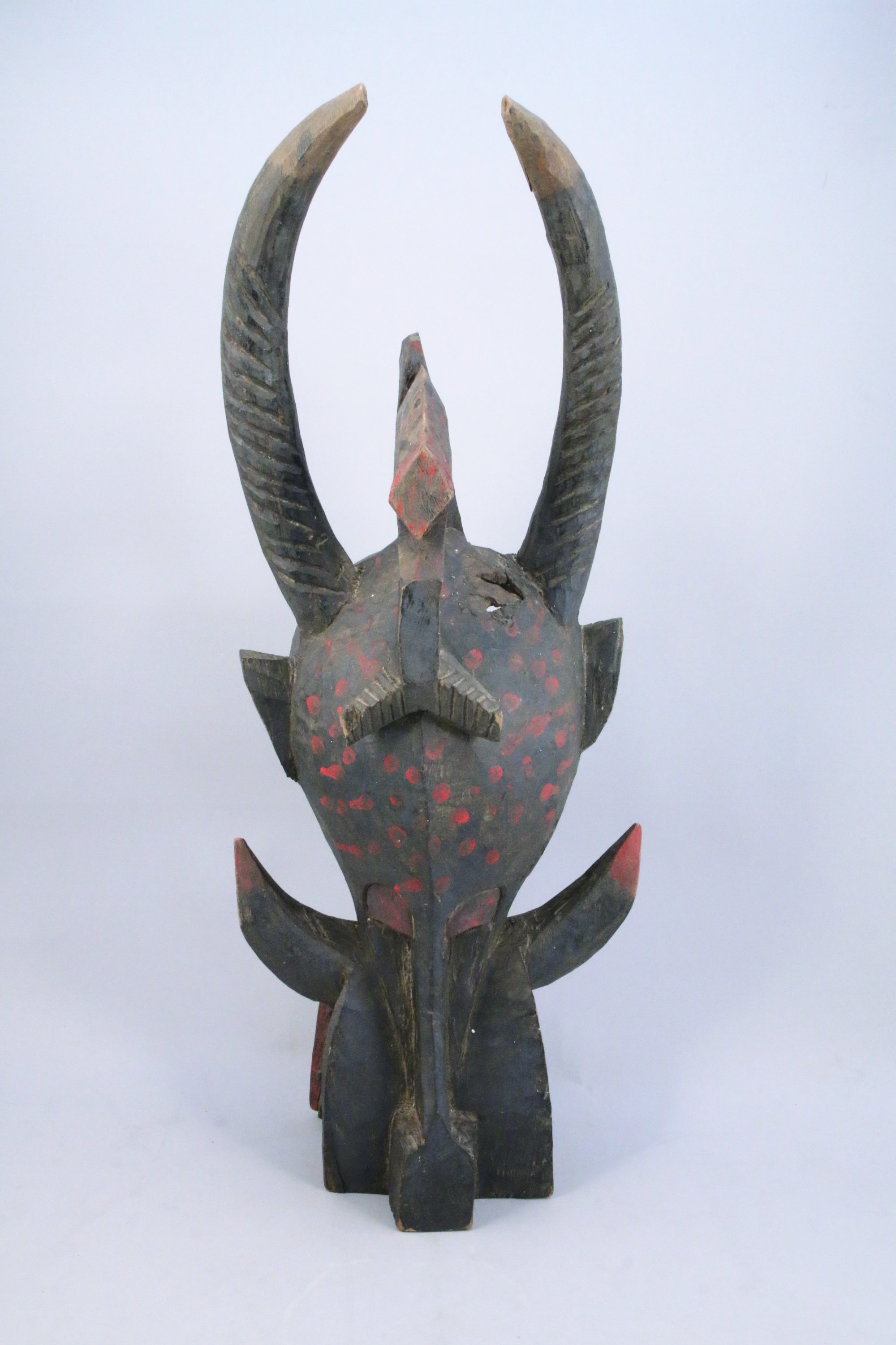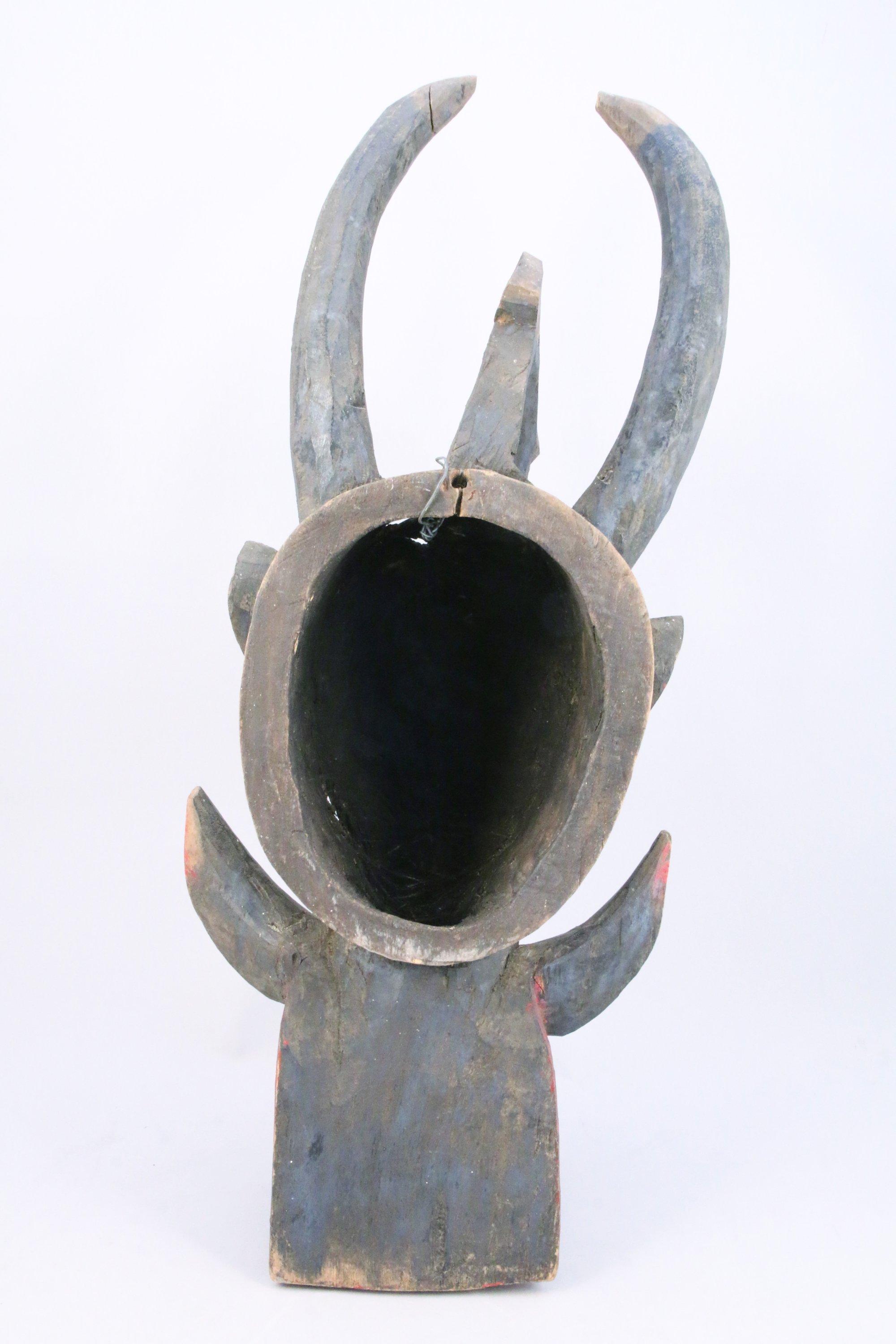 MASQUE HEAUME WANIUGO, dit "cracheur de feu", figurant un animal mythologique hybride : longues cornes d'antilope, mâchoire de hyène, armée de crocs et de défenses de phacochère. Il est utilisé par la société secrète Senoufo du poro pour des rites de fertilité. Bois à patine brune et trace de pigments rouges.