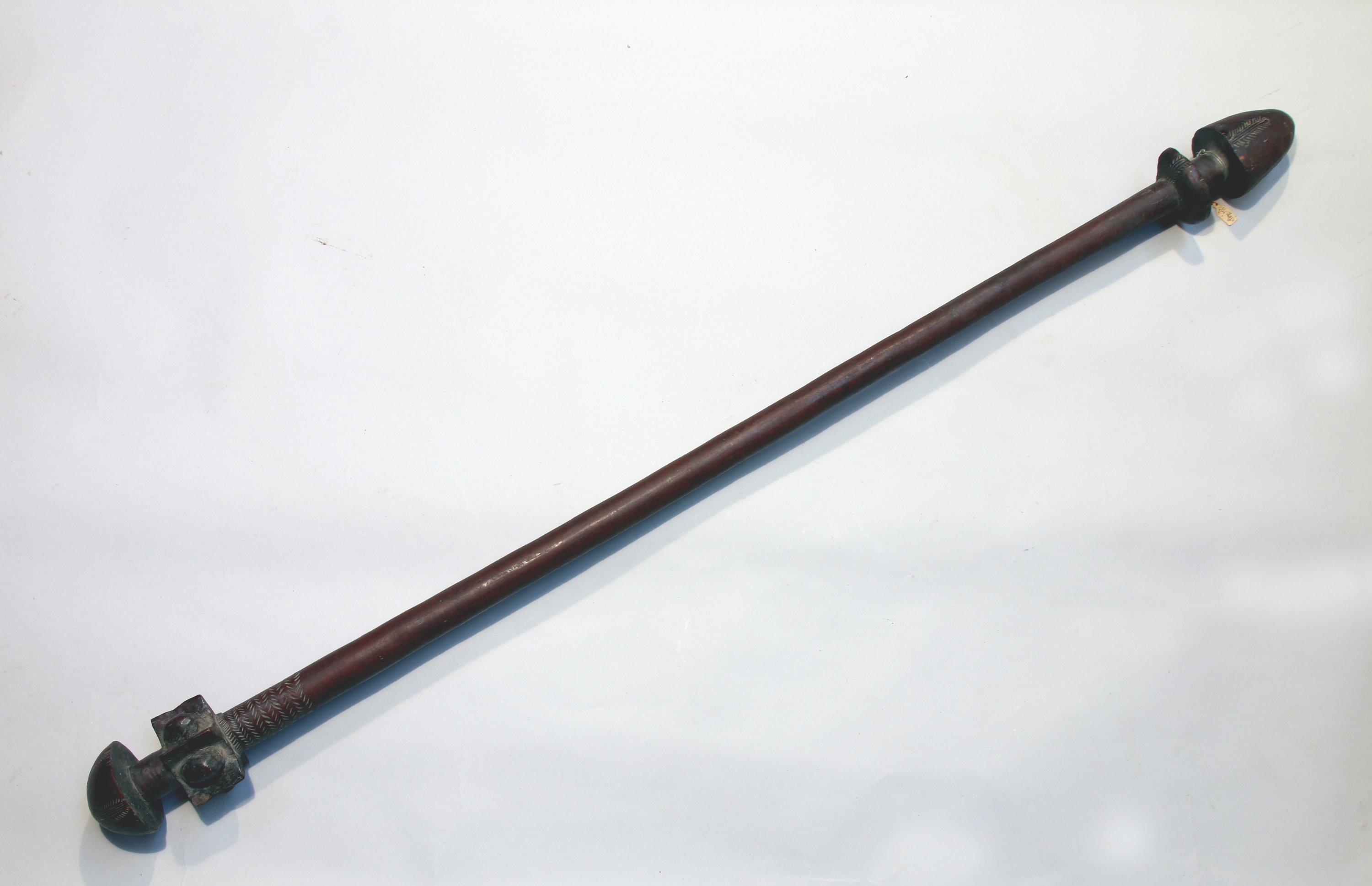 CASSE TÊTE. Bois lourd à patine sombre, décor gravé.