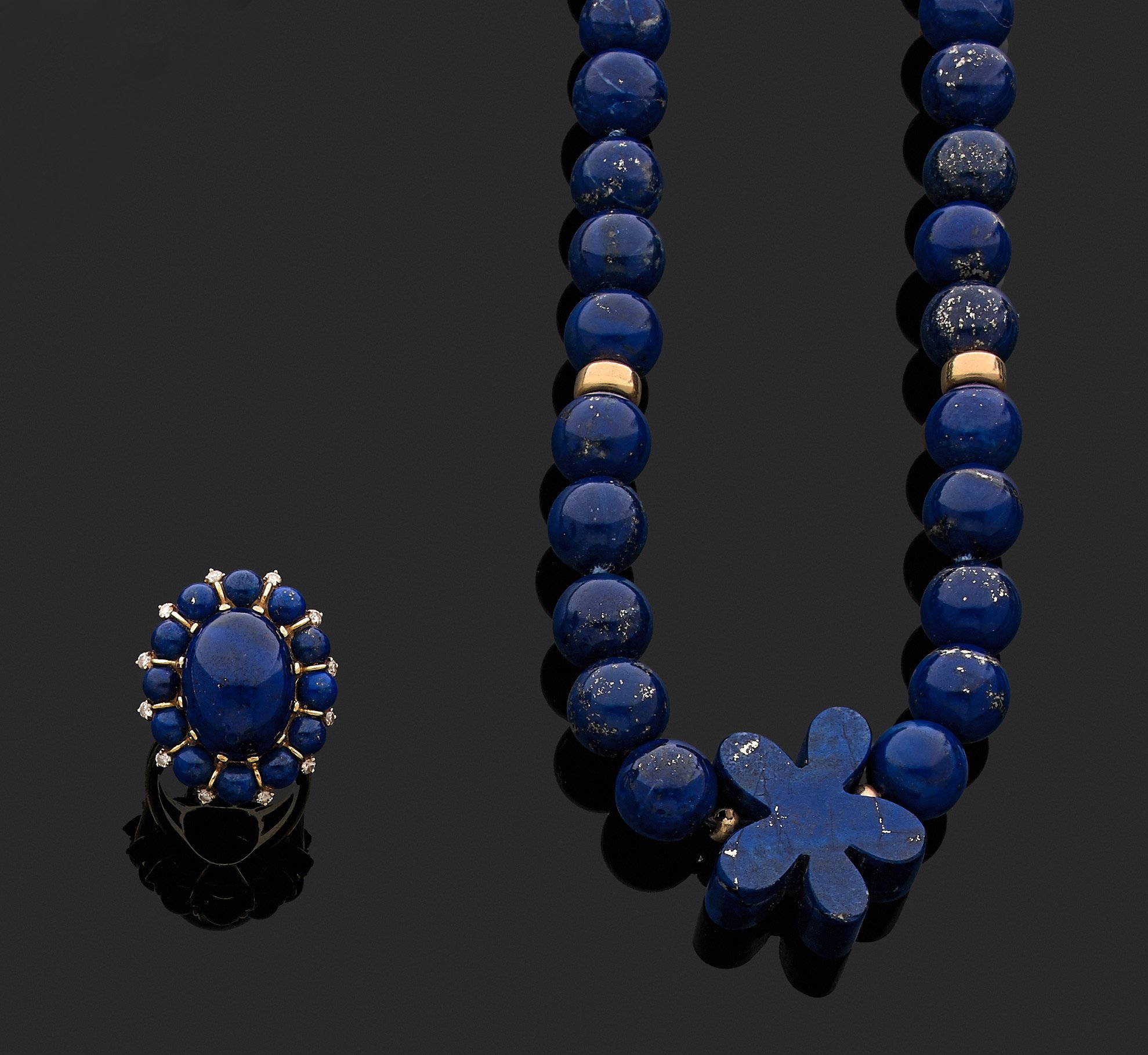 A necklace composed of balls supporting a flower motif in tinted lapis lazuli, with a yellow gold setting, and a yellow gold ring, adorned with cabochons of tinted lapis lazuli, partially set with round brilliant-cut diamonds.