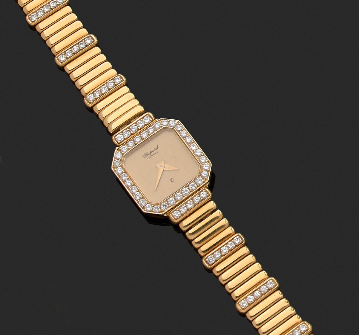 CHOPARD. MONTRE-BRACELET de dame, en or jaune 750 millièmes, la montre de forme octogonale, cadran émaillé jaune, tour de lunette orné de diamants ronds de taille brillant, bracelet souple gravé à décor de godrons, certains maillons sertis d'une ligne de diamants ronds de taille brillant.