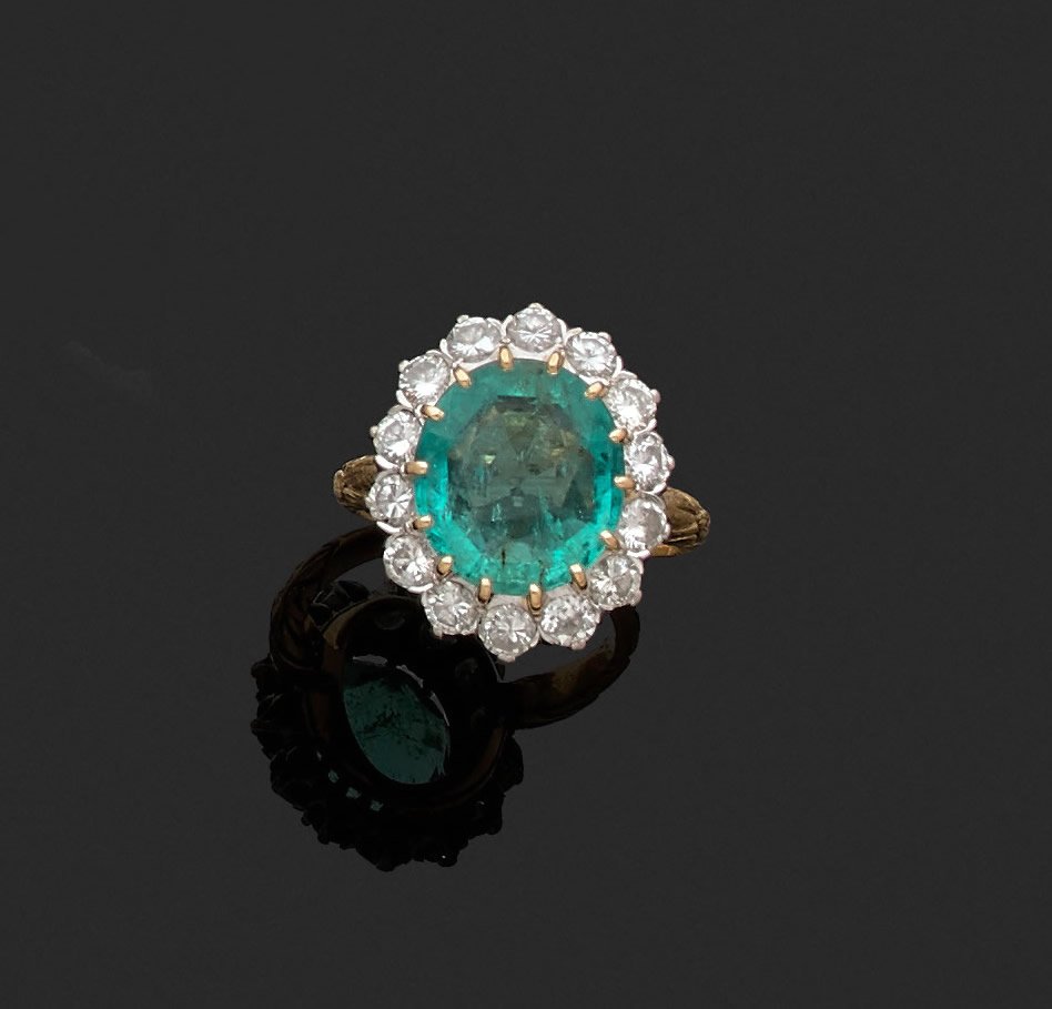 BAGUE en or 750 millièmes de deux tons, ornée d'une émeraude ovale dans un entourage de quatorze diamants ronds de taille brillant.