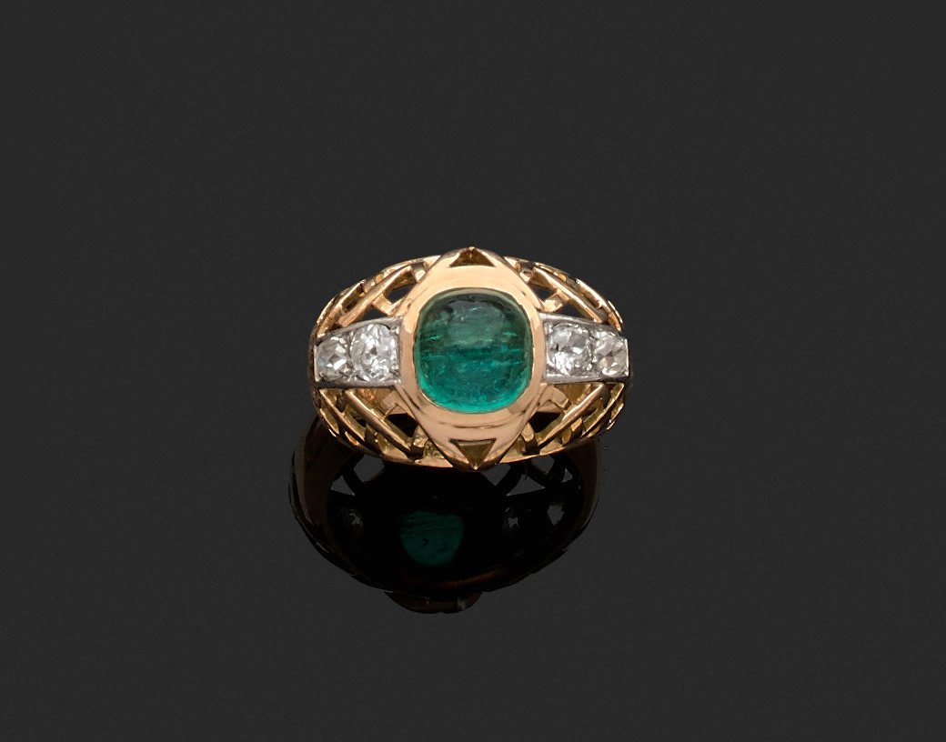An openwork yellow goldand platinum ring, adorned with a cabochon emerald set between four round antique-cut diamonds.