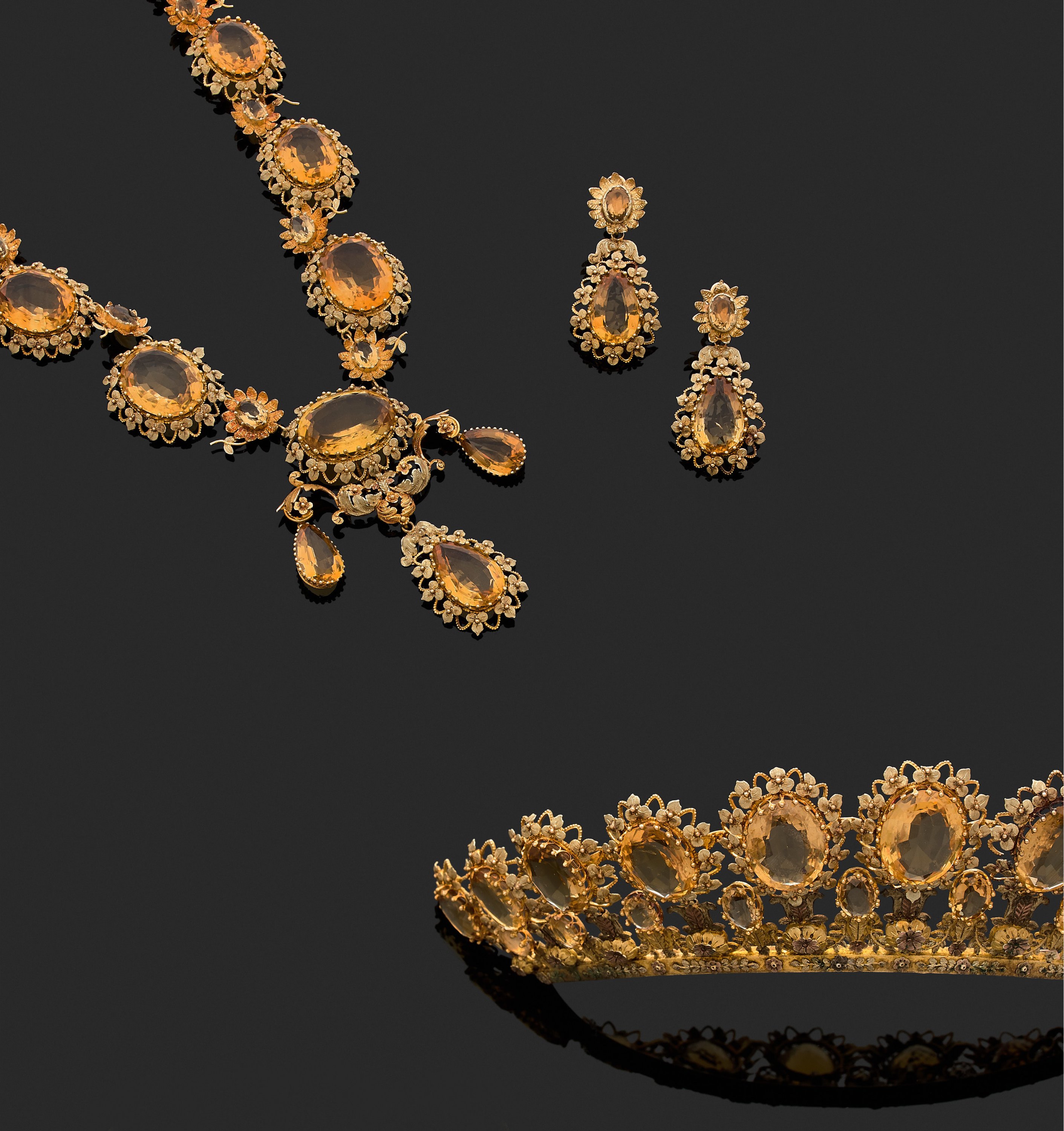 Gold and vermeil tiara, articulated necklace and pair of earrings, decorated with flowers. Adorned with citrines and yellow stones. 19th century.