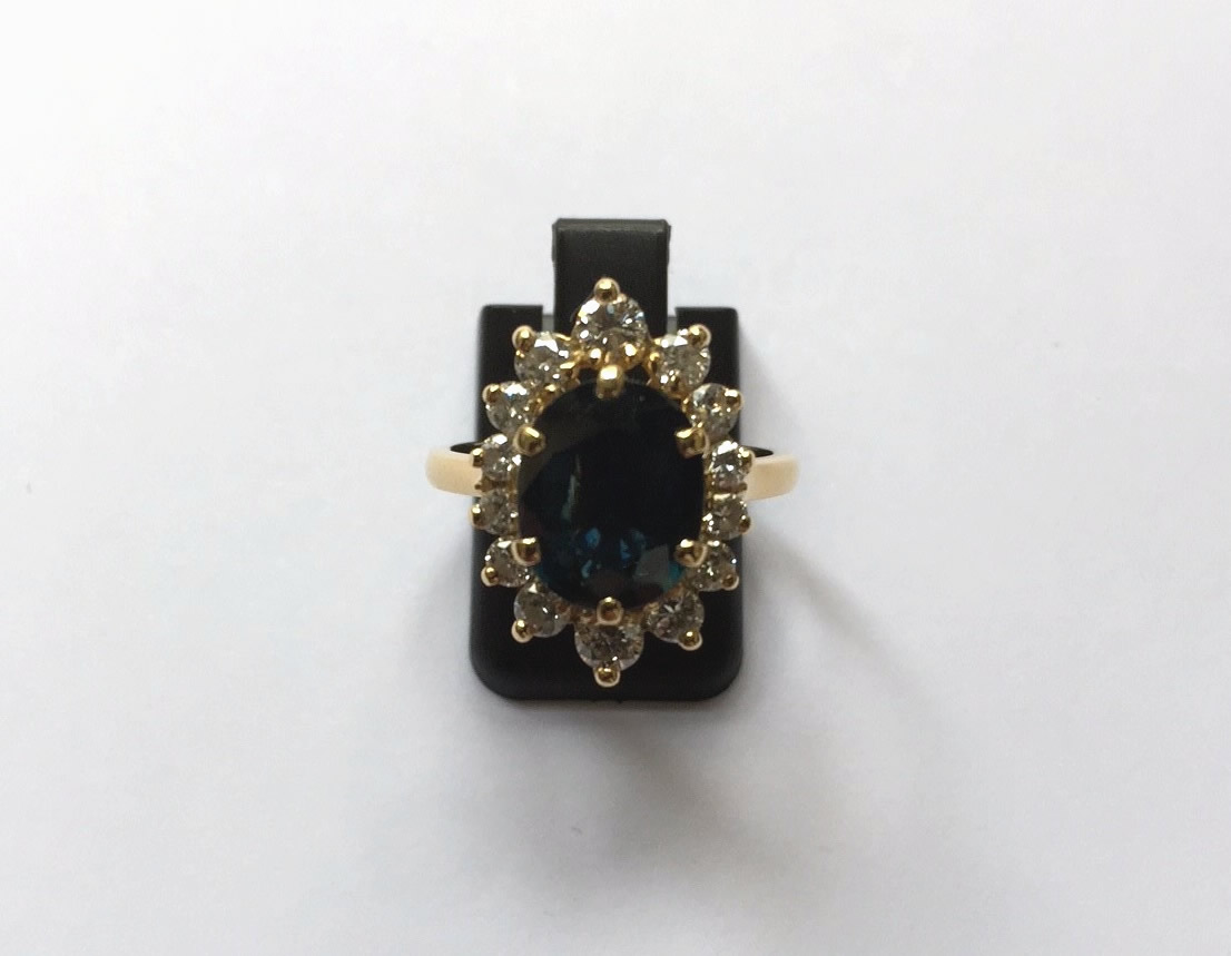 BAGUE en or jaune 750 millièmes, ornée d'un saphir ovale dans un entourage de quatorze diamants ronds de taille brillant.
