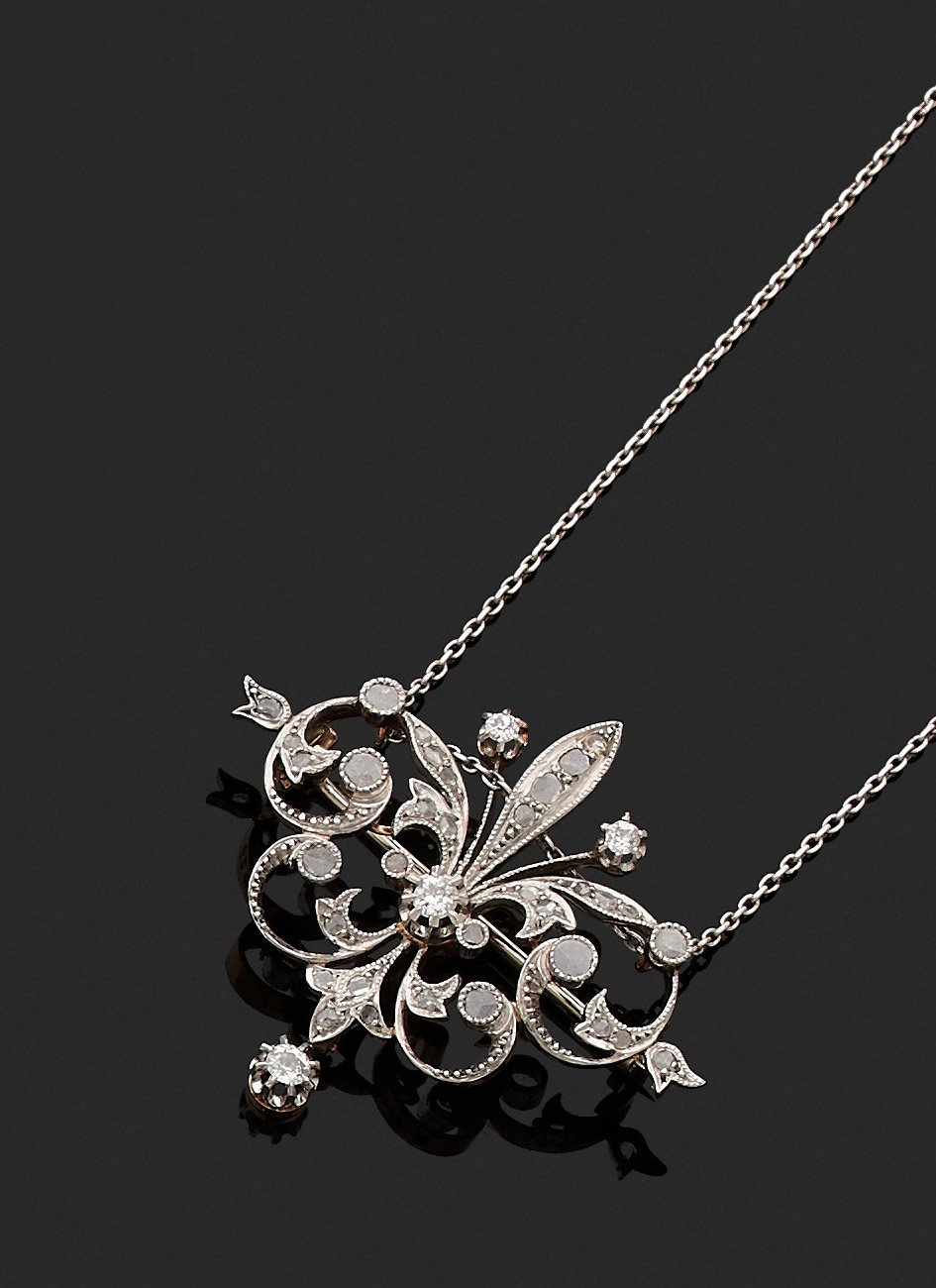 An articulated silver necklace, and a white and yellow gold pendant decorated with fleur-de-lis, adorned with round antique-cut diamonds.