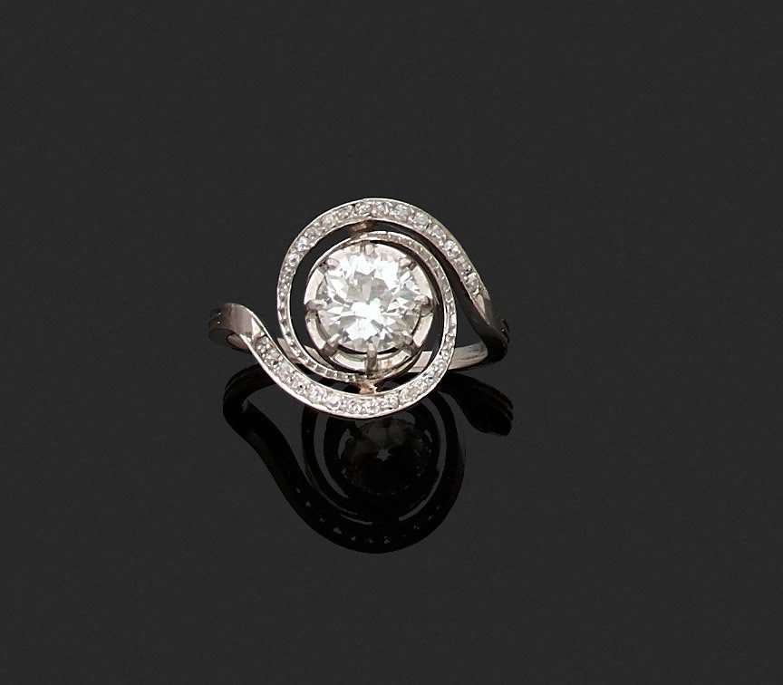 BAGUE en platine 850 millièmes à décor d'enroulement ornée au centre d'un diamant rond de