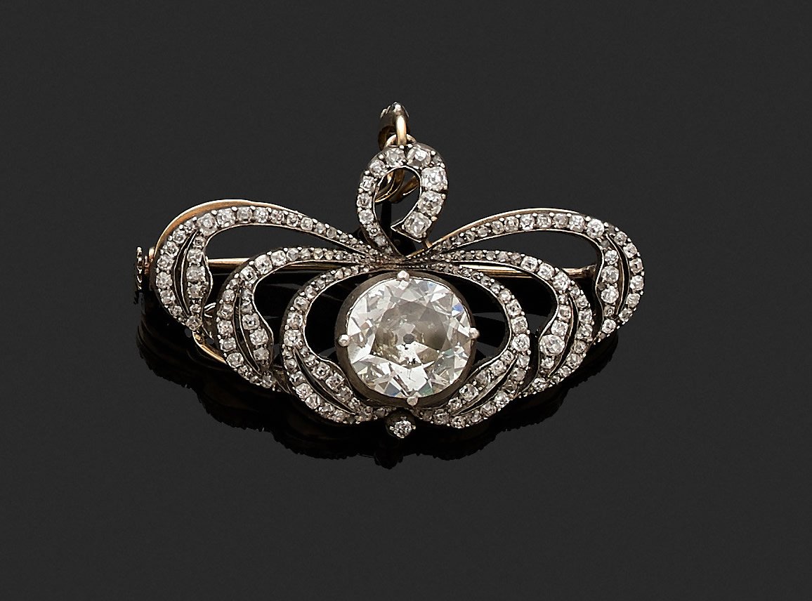 BROCHE pouvant former PENDENTIF en or jaune 585 millièmes et argent 925 millièmes ajouré, ornée au centre d'un diamant coussin de taille ancienne serti clos entre des lignes de diamants taillés en rose et de taille ancienne. L'épingle en or 375 millièmes.